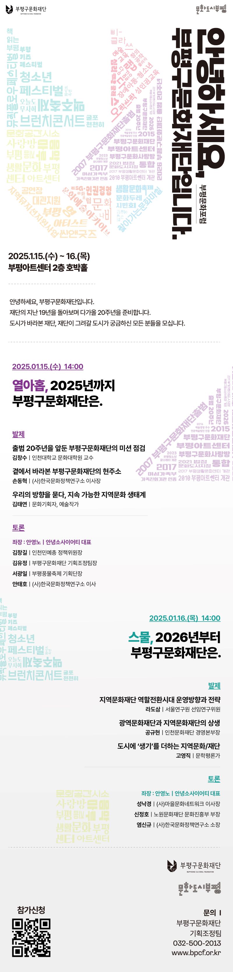 ![]() 2025년 부평문화포럼 <안녕하세요, 부평구문화재단입니다.> [일 시] 2025.1.15.(수) ~ 1.16.(목) 14:00 / 2일 [장 소] 부평아트센터 2층 호박홀 [주요내용] 2025.1.15.(수) 14:00 열아홉, 2025년까지 부평구문화재단은. 발 제 <출범 20주년을 앞둔 부평구문화재단의 미션 점검> 김창수(인천대학교 문화대학원 교수) <곁에서 바라본 부평구문화재단의 현주소> 손동혁((사)한국문화정책연구소 이사장) <우리의 방향을 묻다, 지속 가능한 지역문화 생태계> 김태연(문화기획자, 예술작가) 토 론 좌장: 안영노(안녕소사이어티 대표), 김창길(인천민예총 정책위원장), 김유정(부평구문화재단 기획조정팀장), 서광일(부평풍물축제 기획단장), 안태호((사)한국문화정책연구소 이사) 2025.1.16.(목) 14:00 스물, 2026년부터 부평구문화재단은. 발 제 <지역문화재단 역할전환시대 운영방향과 전략> 라도삼(서울연구원 선임연구위원) <광역문화재단과 지역문화재단의 상생> 공규현(인천문화재단 경영본부장) <도시에 '생기'를 더하는 지역문화/재단> 고영직(문학평론가) 토 론 좌장: 안영노(안녕소사이어티 대표) 성낙경((사)마을문화네트워크 이사장) 신정호(노원문화재단 문화진흥부 부장) 염신규((사)한국문화정책연구소 소장) [참석대상] 지역문화재단 종사자 및 관계자, 지역예술가 그리고 시민 누구나 [참여방법] 온라인 사전 신청(https://naver.me/GQ17alpt) [문 의] (재)인천광역시부평구문화재단 기획조정팀(032-500-2013)
