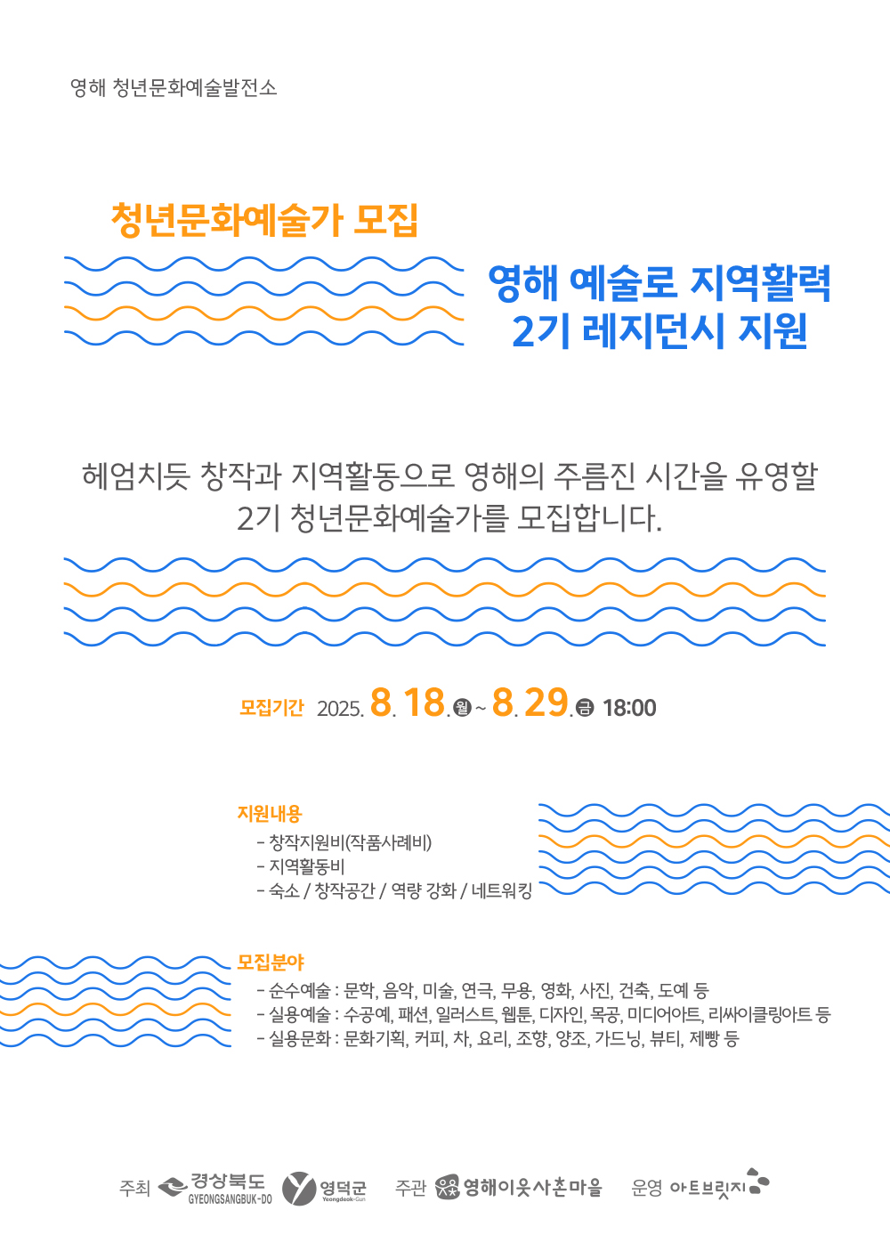 ![]() 영해는 여름이 지나도 구리빛 여름입니다. 점선이 되가는 만세시장에서, 축산항 가는 버스 안에서, 문화반점 옛날짜장 앞에서 영해의 주름진 시간을 유영하는 1기 청년문화예술가들도 아직 여름 영해를 손에 쥐고 있습니다. 경북 영덕군 영해면은 잘 알려지지 않았지만 나른한 ‘고양이의 시간’이 흐르는 동쪽 바다 앞 보물 같은 마을입니다. 매끄러운 도시와 다르게 영해의 나른한 리듬은 청년문화예술가들에게 또 다른 출구를 발명하는 질문이 되고 창작의 에너지가 될 수 있습니다. 영해의 바다와 하늘, 바람, 시간, 사람들이 5개월을 함께 할 청년문화예술가들을 초대합니다. ◾ 참가자격 : 만 19세 ~ 45세 이하 ◾ 모집기간 : 8.18(월) ~ 8. 29.(금) 18시 ◾ 접수 방법 : 구글폼 신청 https://forms.gle/HYYPodDPWwb5KQbA6 주최 : 경상북도, 영덕군 주관 : 영덕군 이웃사촌마을지원센터 운영 : 아트브릿지