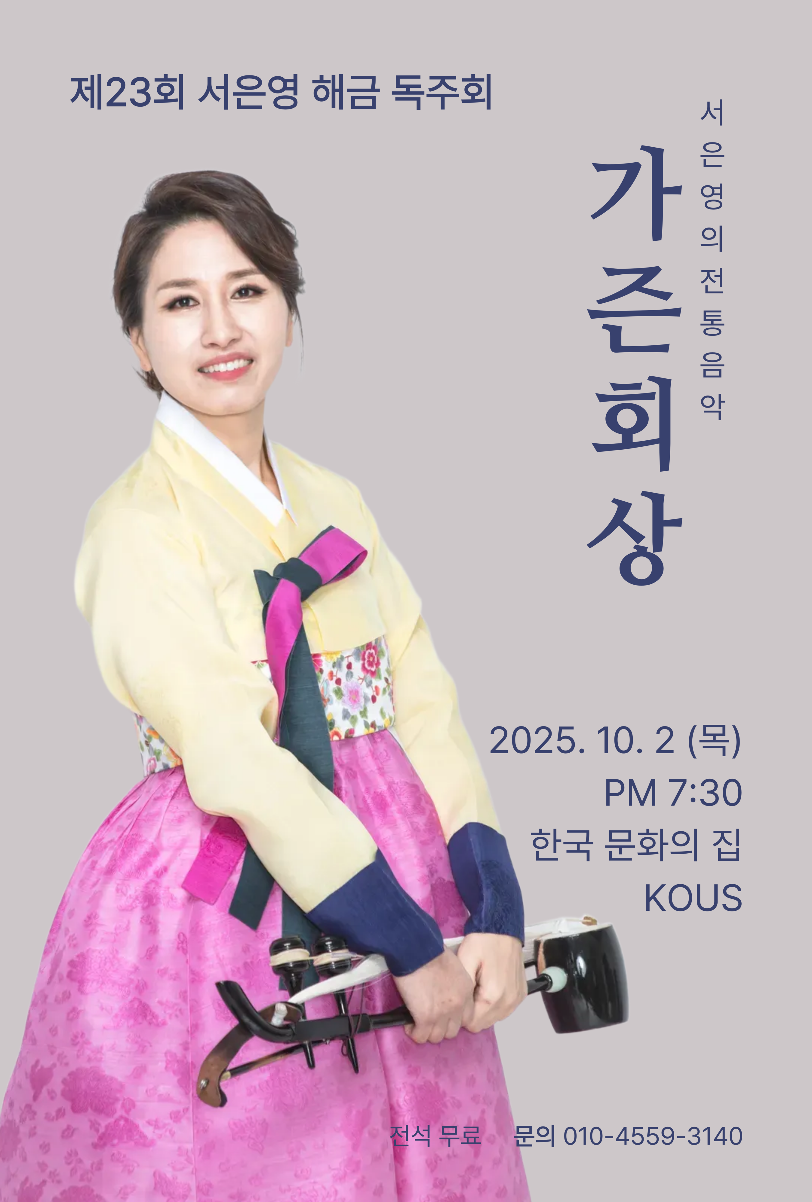 제23회 서은영 해금 독주회-서은영의 전통음악 가즌회상 일시: 2025년 10월 2일 목요일 저녁7:30 장소: 한국문화의집 KOUS 티켓: 전석초대