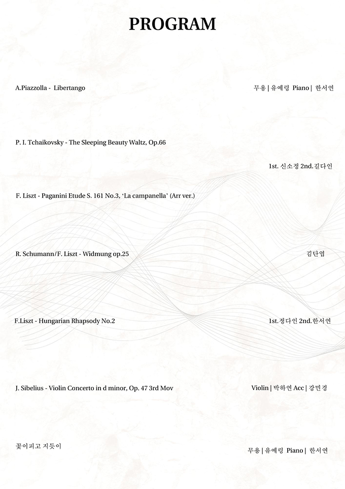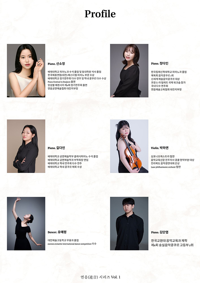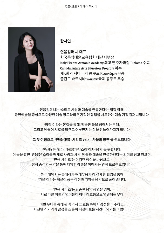 ‘연(連)’은 ‘잇다’, ‘음(音)’은 ‘소리’이자 ‘음악’을 뜻합니다. 이 둘을 합친 ‘연음’은 소리를 매개로 사람과 사람, 예술과 예술을 연결하겠다는 의미를 담고 있으며, ‘연음 시리즈’는 이러한 정신을 바탕으로, 창작 중심의 음악을 통해 다양한 예술을 이어가는 연작 프로젝트입니다. 본 무대에서는 클래식과 현대무용과의 섬세한 협업을 통해 ‘가을’이라는 계절이 품은 감정과 기억을 음악으로 풀어냅니다. ‘연음 시리즈’는 단순한 음악 공연을 넘어, 서로 다른 예술의 언어들이 하나의 흐름으로 연결되는 무대입니다.