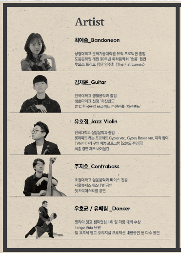 탱고밴드 윤슬 <탱고밴드 윤슬>은 ‘햇빛이나 달빛에 비치어 반짝이는 잔물결’ 이라는 뜻을 가진 단어 ‘윤슬’과 반도네오니스트 최예슬과 기타리스트 김재윤의 이름을 합쳐 만들어진 팀입니다. 탱고를 통한 감동과 아름다움이 마치 빛나는 윤슬처럼 사람들의 마음에 남기를 바라는 의미를 담고 있습니다. 반도네오니스트 최예슬이 기획한 <반도네온, 탱고의 밤 - 아스토르 피아졸라의 세계>는 흔하게 볼 수 없는 반도네온이라는 악기와 기타, 재즈 바이올린, 콘트라베이스의 정열적이고도, 감각적인 사운드를 느낄 수 있는 공연입니다. 댄서 분들과의 협연을 통해 다채로운 매력을 보여드리니 많은 관심 부탁드립니다!