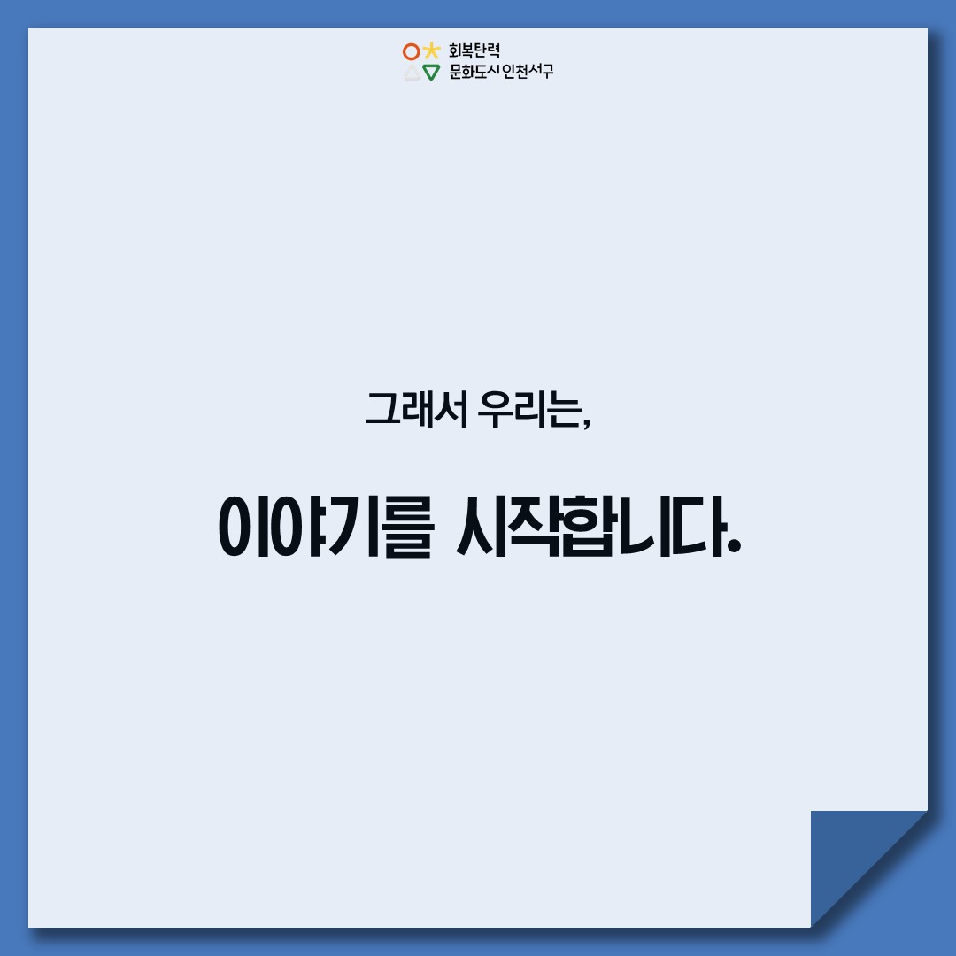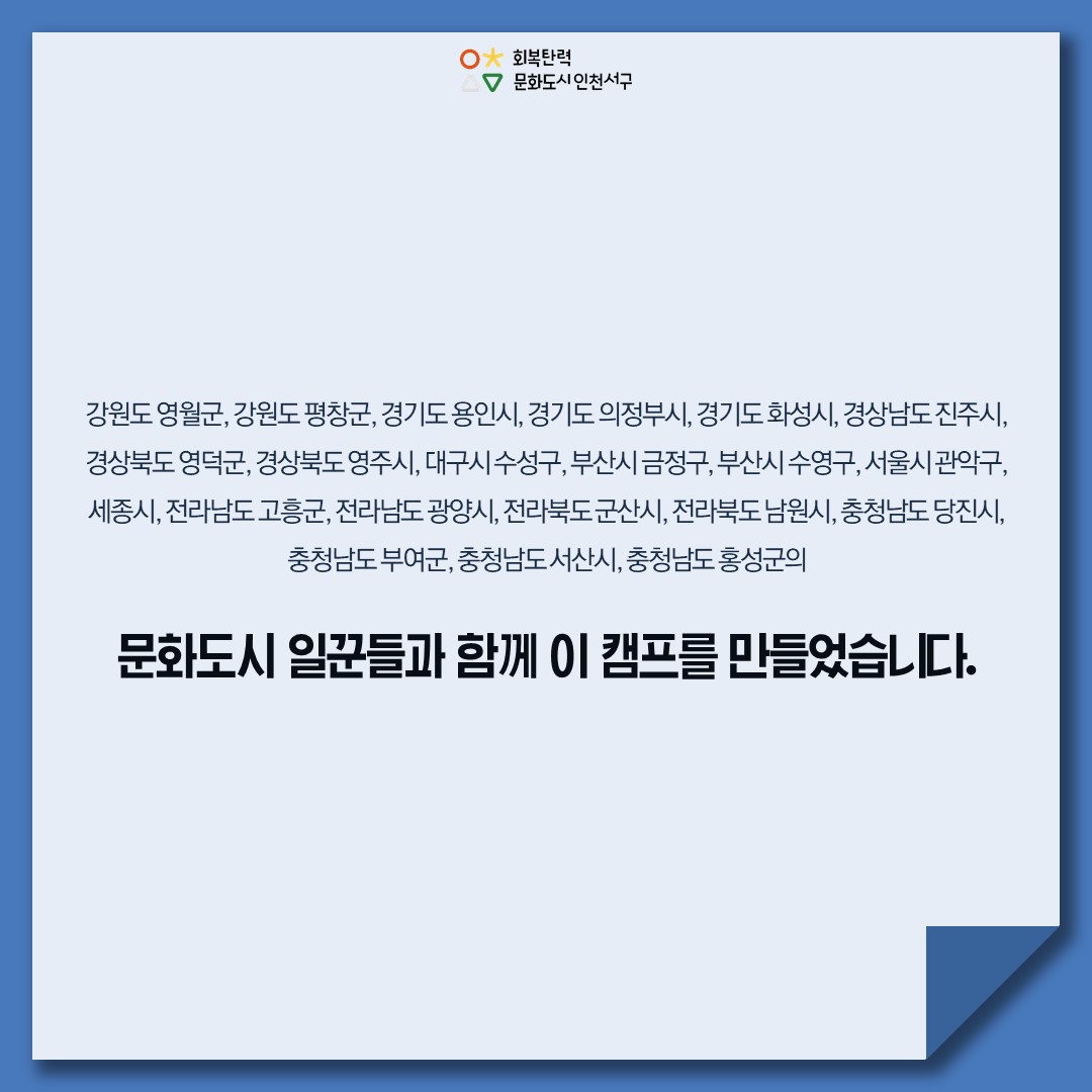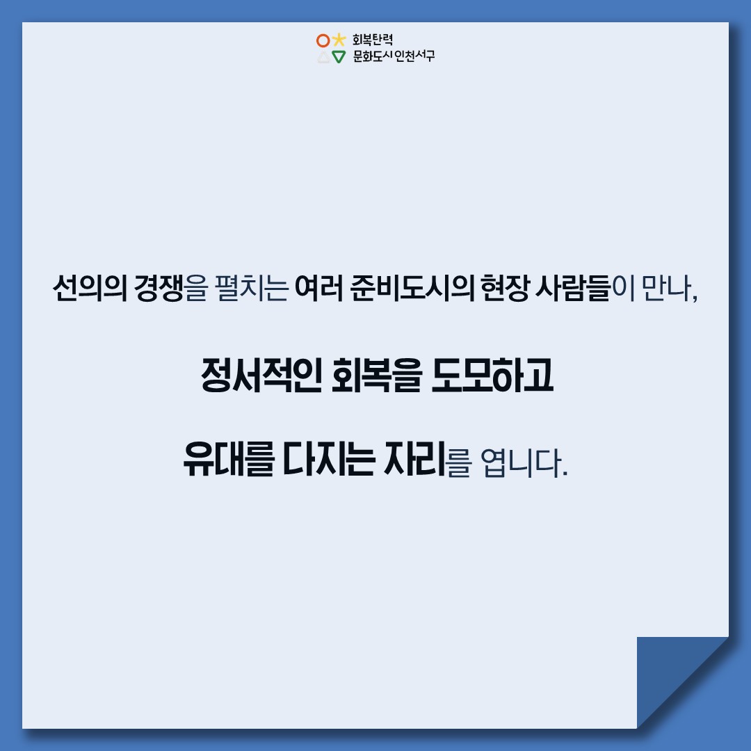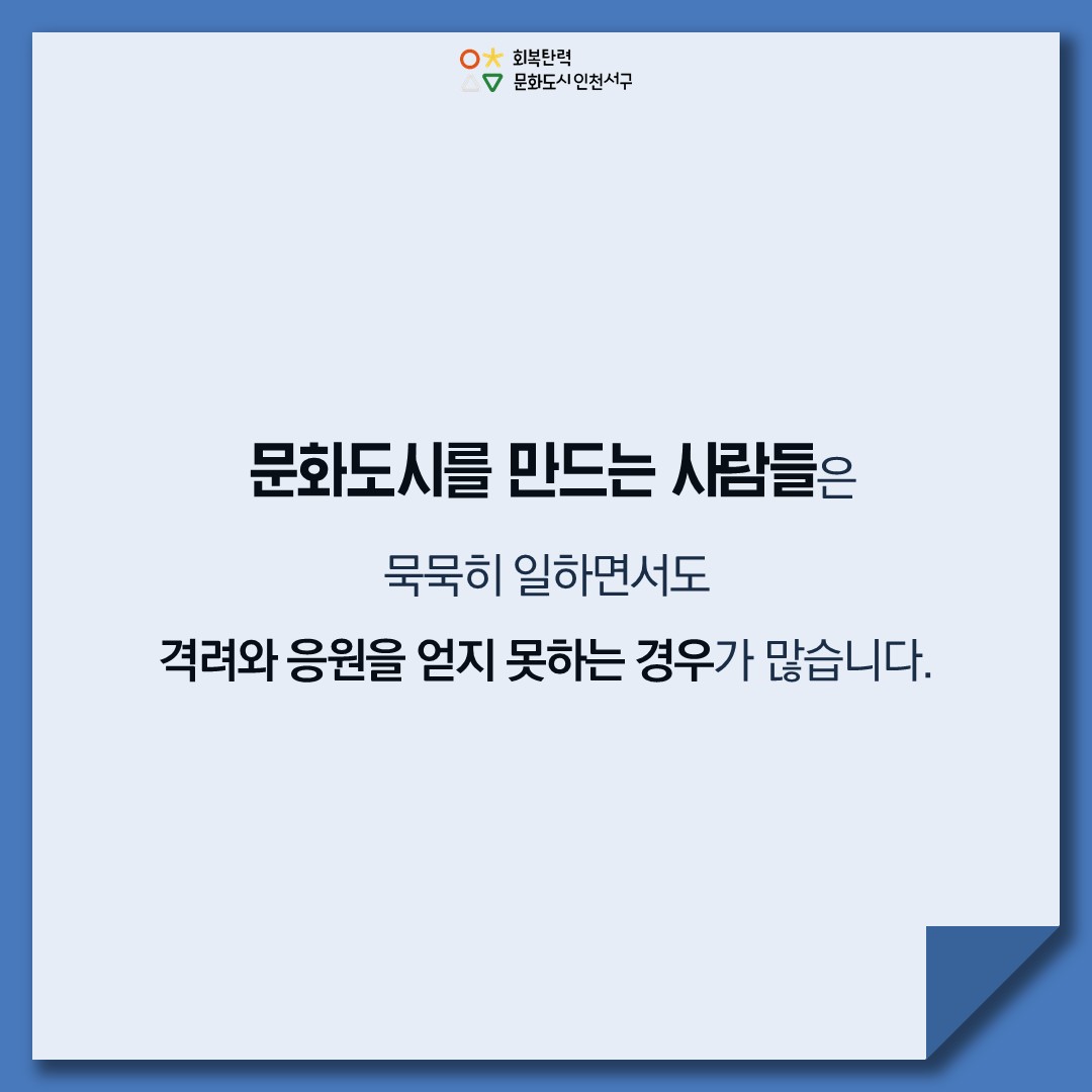 예비문화도시인 우리 인천서구는 회복탄력의 도시를 지향합니다. 지난 7월 16일, 우리 도시는 문화도시 준비에 애쓰고 계신 각 도시 관계자들의 치유와 회복을 이야기하는 자리를 만들었습니다. 각자의 고민과 경험, 개인의 성장을 터놓고 얘기하는 허심탄회한 이야기 마당으로 기획된 본 행사를 통해, 9개 도시, 30명의 문화도시 실무자들이 모여 도시문화를 만들어가는 우리들 스스로를 존중하고 지난한 과정으로 지친 마음을 치유, 회복할 수 있는 시간을 가졌습니다. 무엇보다 도시 간 친교를 통해 자신이 속한 도시를 넘어 문화도시의 지평을 넓혀 가는 인재로서의 자부심과 결속감을 확인할 수 있는 시간이었습니다. 사람을 소중하게 여기는 회복의 비타민 같은 잔치, 아래 카드뉴스와 함께 그 현장을 소개합니다.