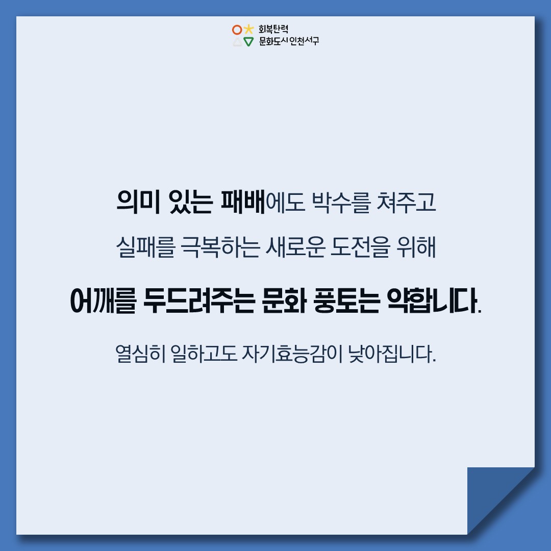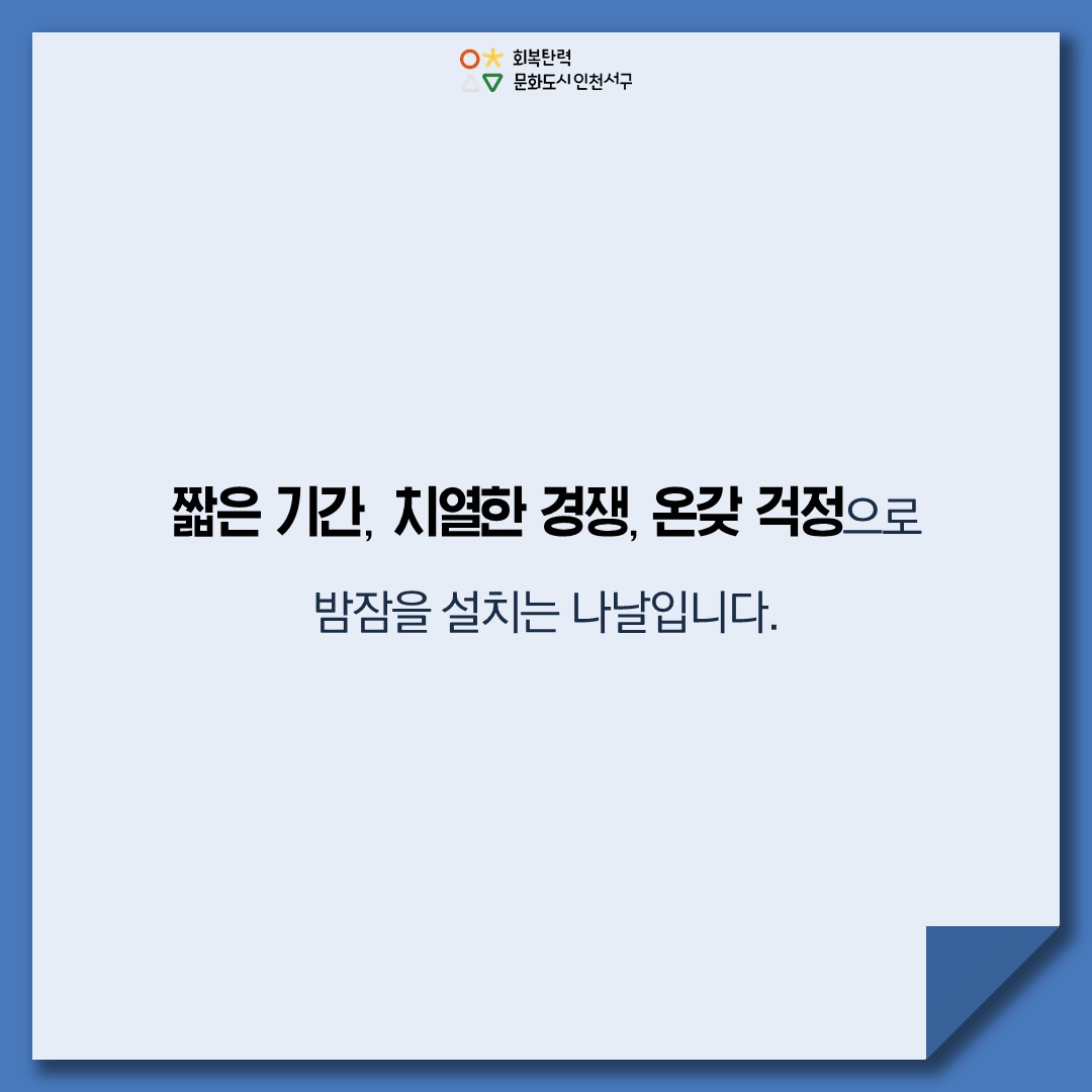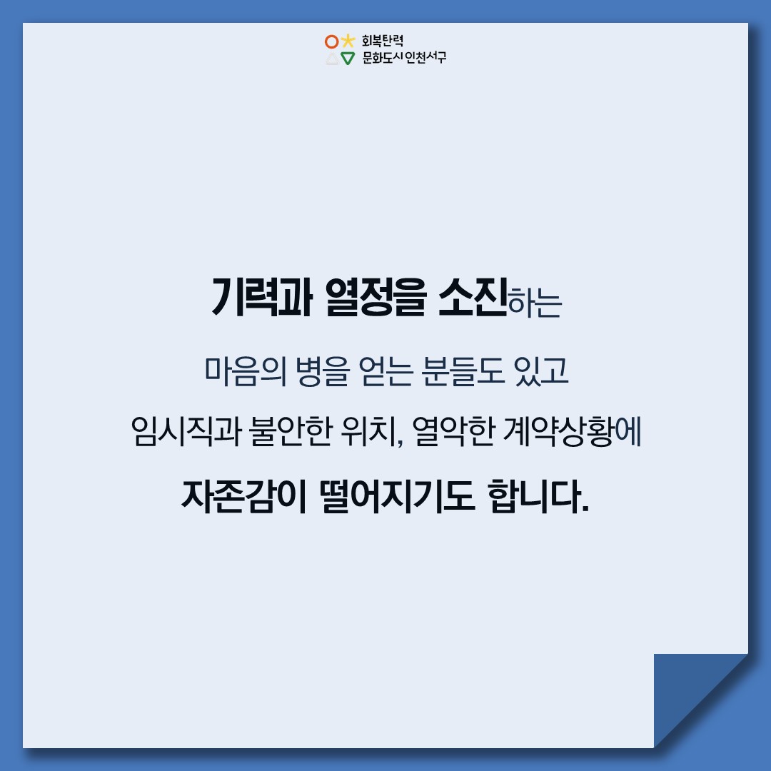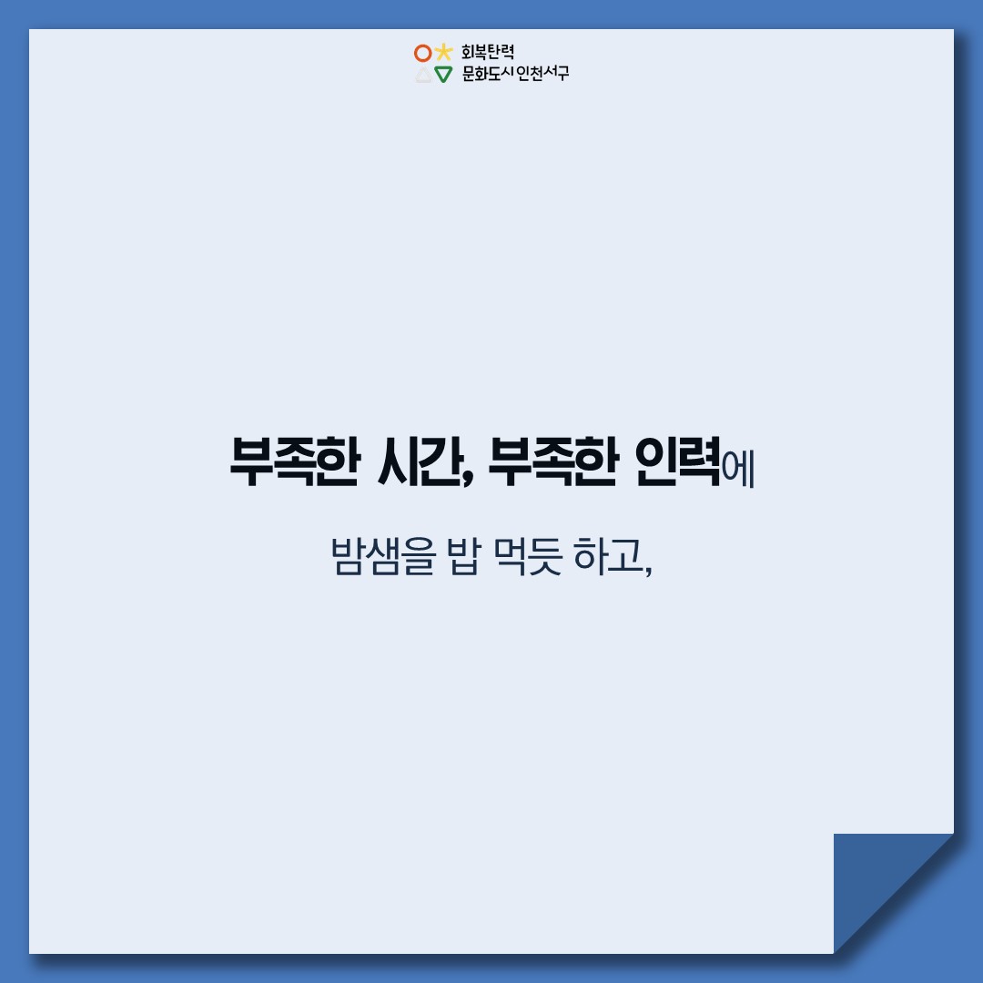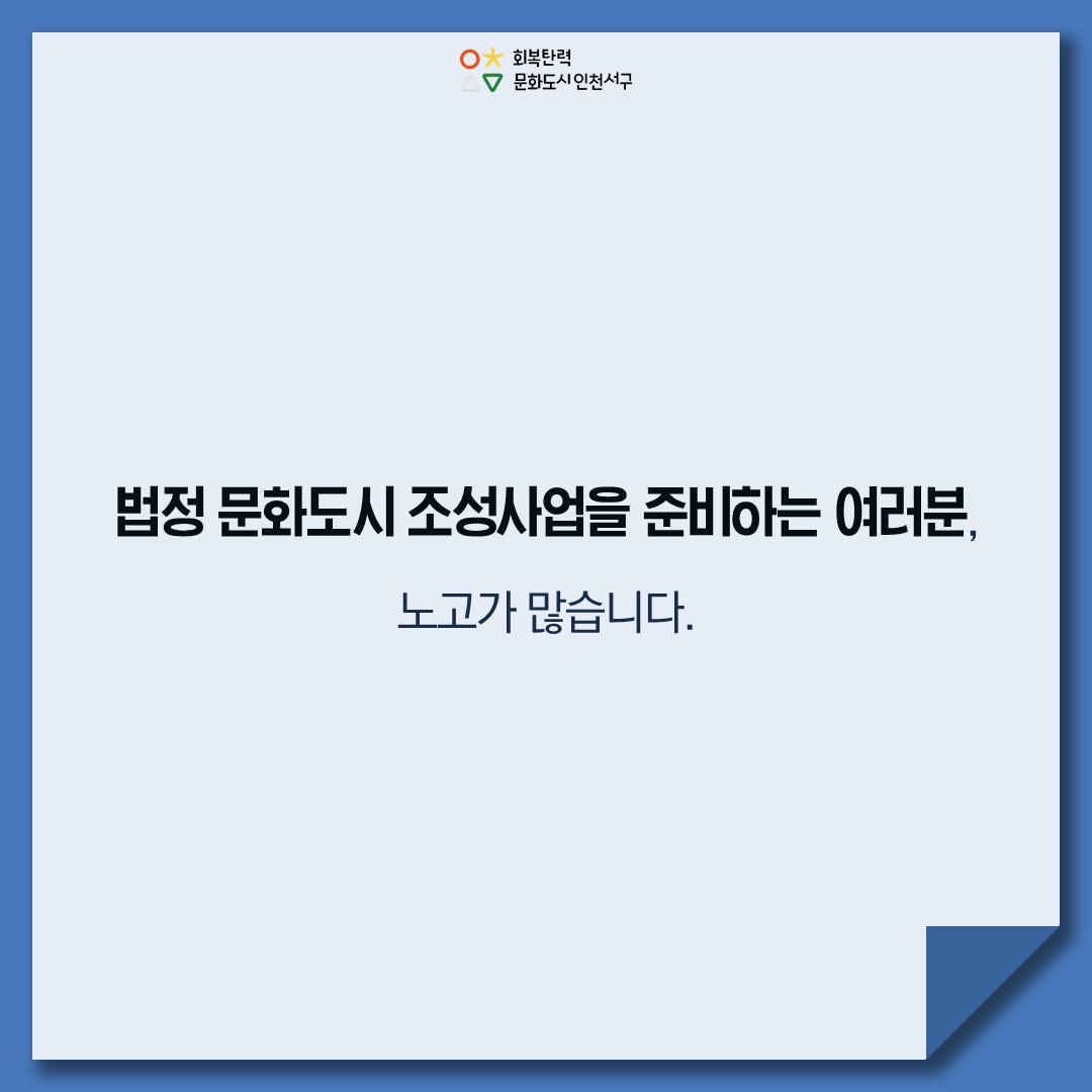 예비문화도시인 우리 인천서구는 회복탄력의 도시를 지향합니다. 지난 7월 16일, 우리 도시는 문화도시 준비에 애쓰고 계신 각 도시 관계자들의 치유와 회복을 이야기하는 자리를 만들었습니다. 각자의 고민과 경험, 개인의 성장을 터놓고 얘기하는 허심탄회한 이야기 마당으로 기획된 본 행사를 통해, 9개 도시, 30명의 문화도시 실무자들이 모여 도시문화를 만들어가는 우리들 스스로를 존중하고 지난한 과정으로 지친 마음을 치유, 회복할 수 있는 시간을 가졌습니다. 무엇보다 도시 간 친교를 통해 자신이 속한 도시를 넘어 문화도시의 지평을 넓혀 가는 인재로서의 자부심과 결속감을 확인할 수 있는 시간이었습니다. 사람을 소중하게 여기는 회복의 비타민 같은 잔치, 아래 카드뉴스와 함께 그 현장을 소개합니다.