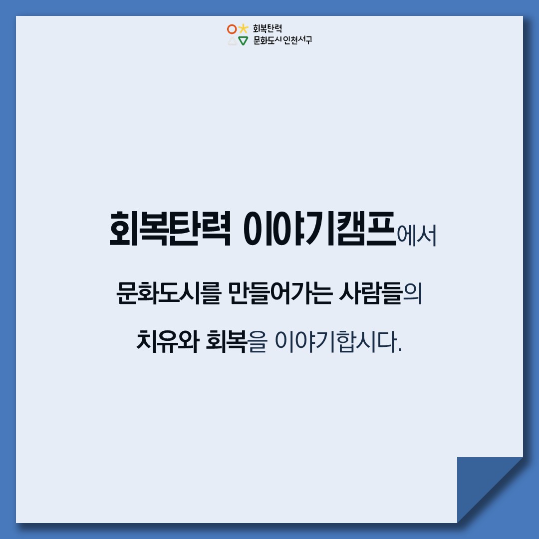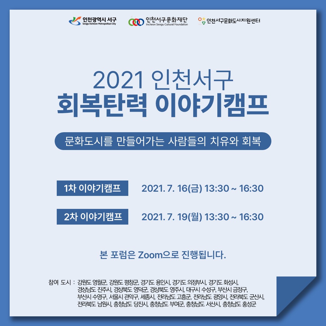 2021 제1차 인천서구 회복탄력 이야기캠프 : 문화도시를 만들어가는 사람들의 치유와 회복 | |||