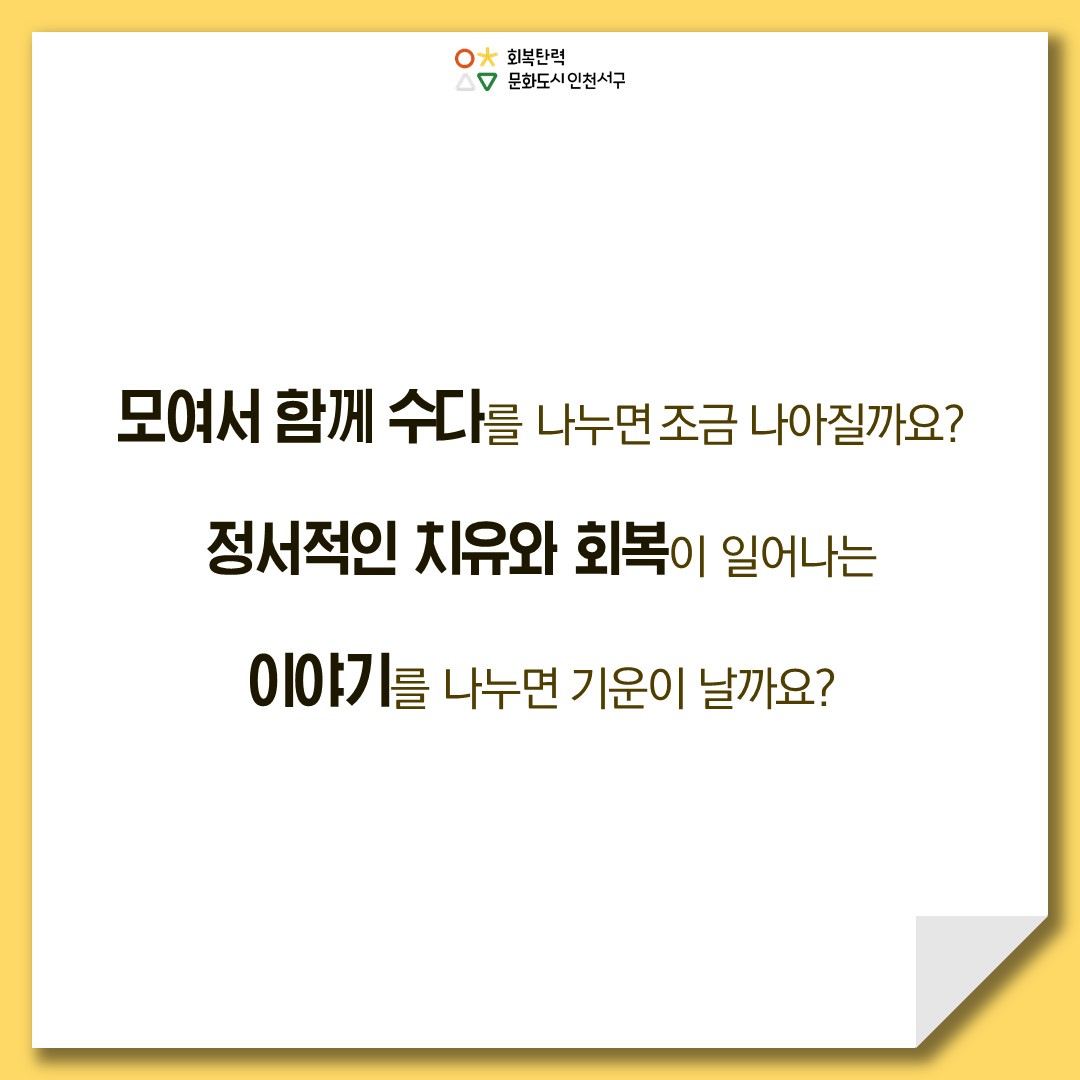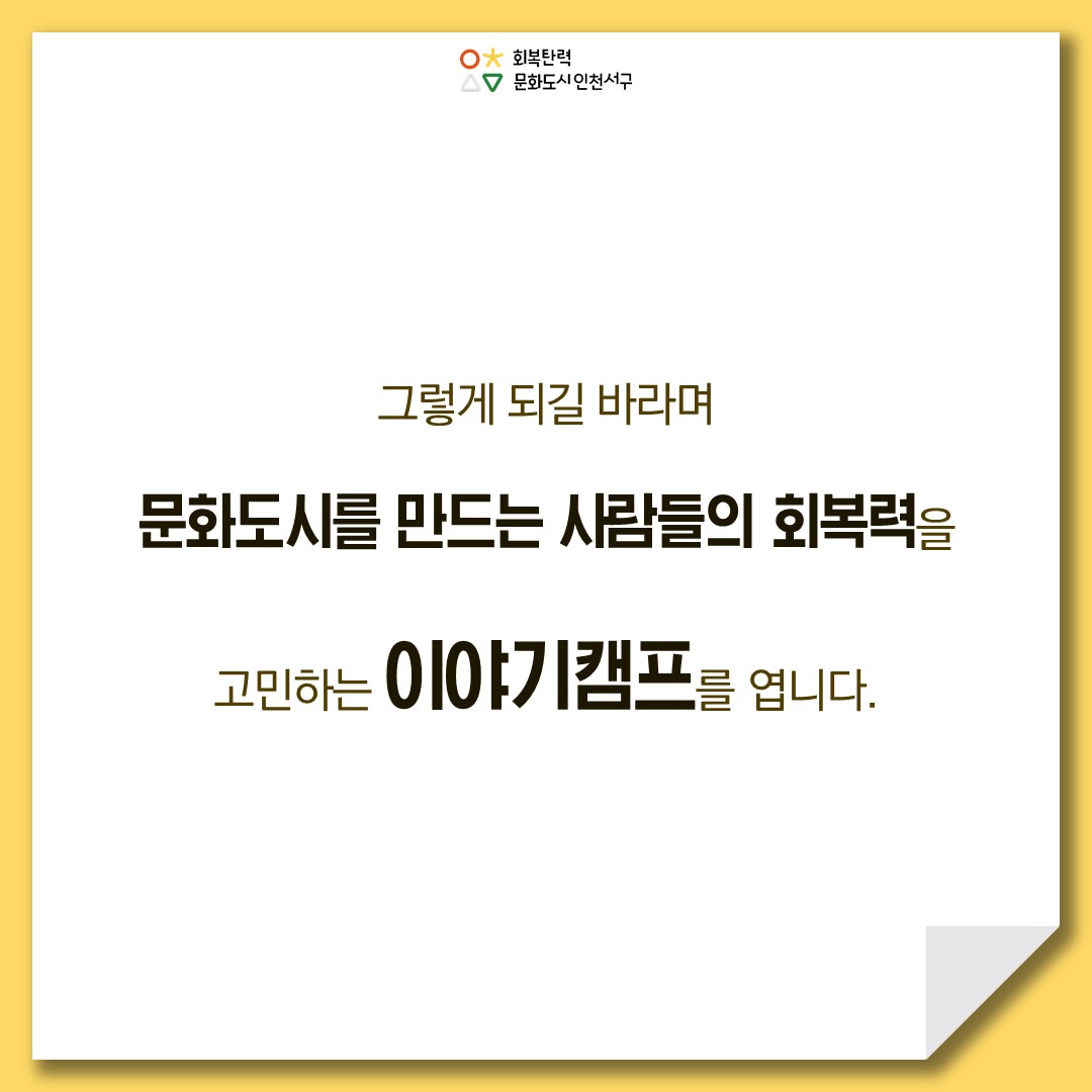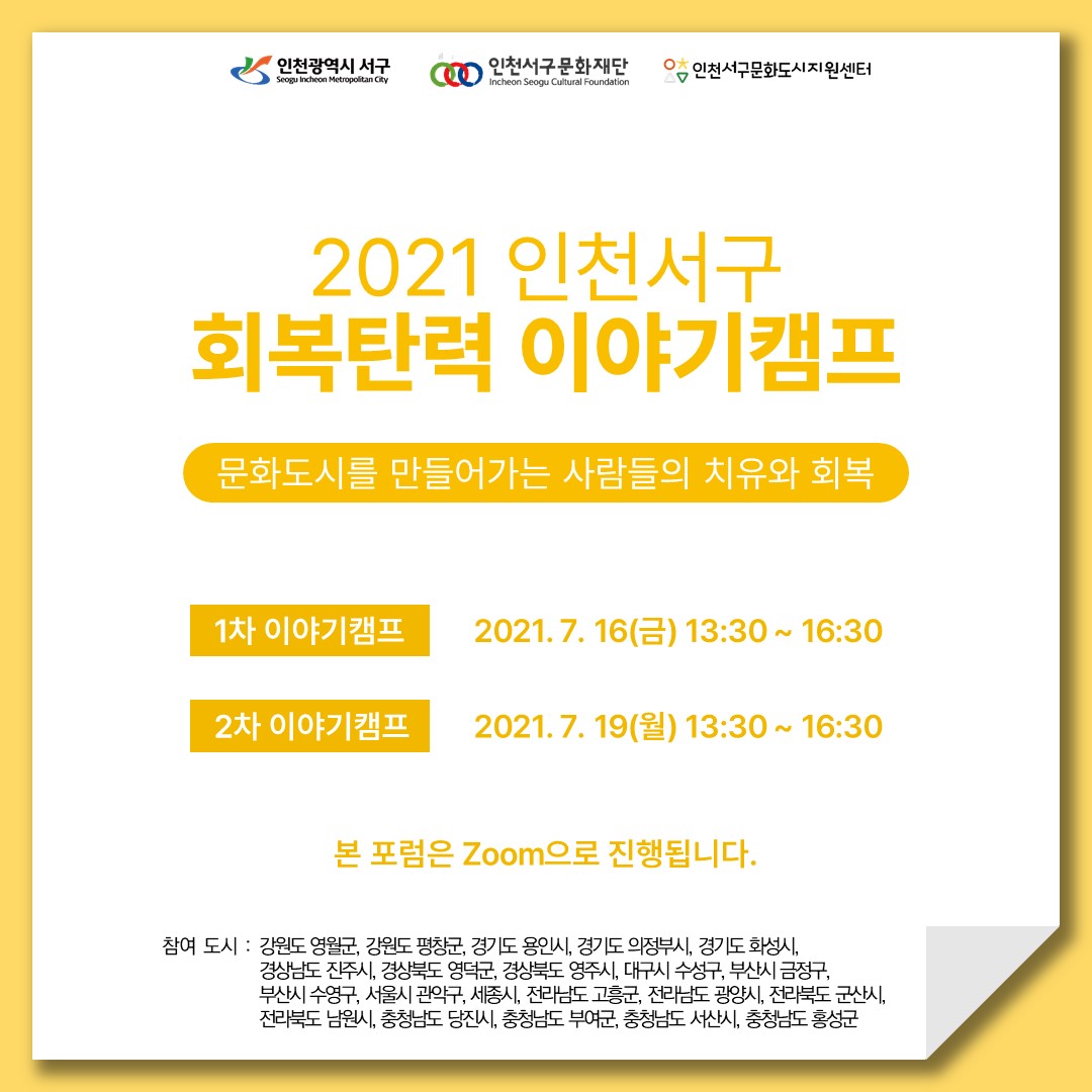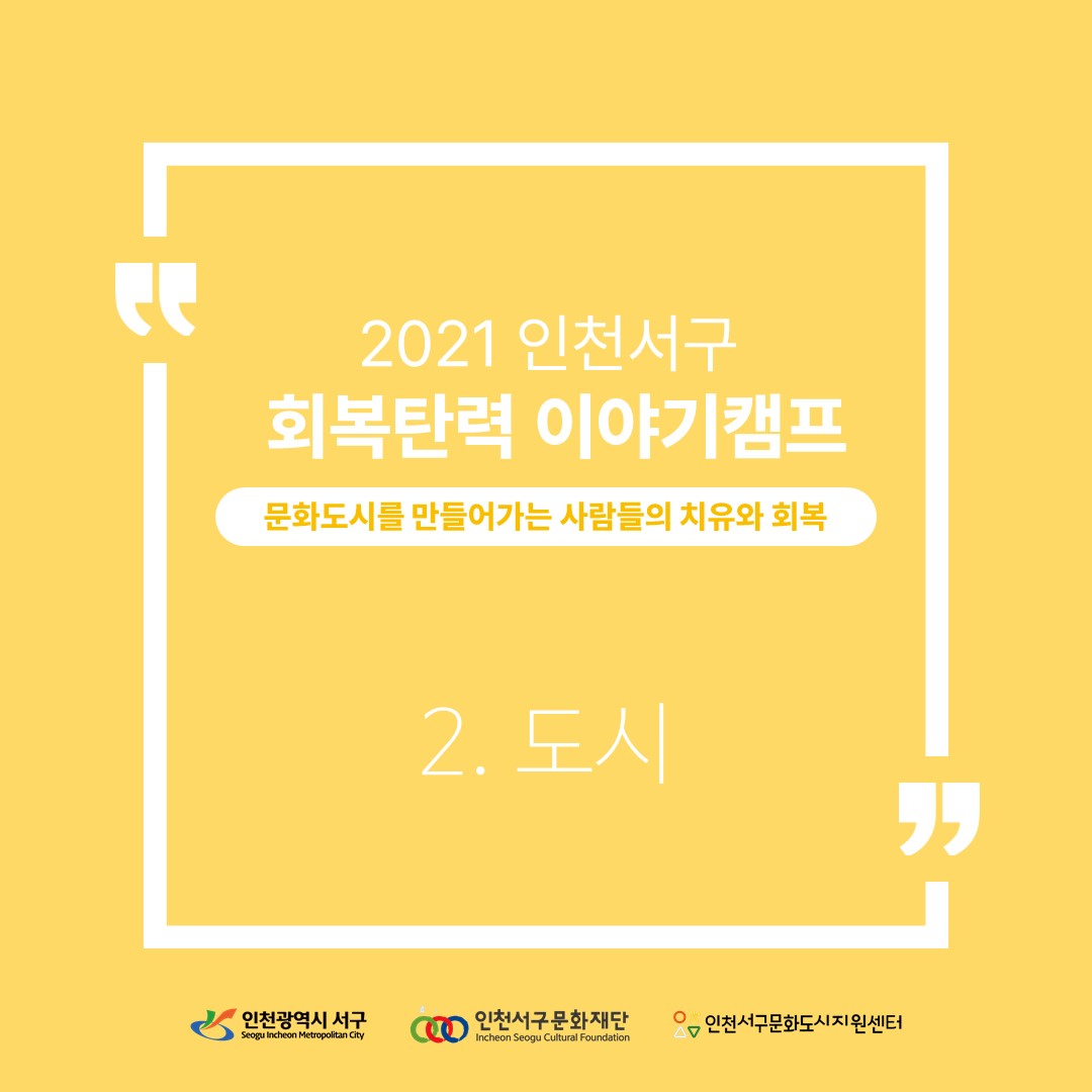 2021 제2차 인천서구 회복탄력 이야기캠프 : 문화도시를 만들어가는 사람들의 치유와 회복 | |||