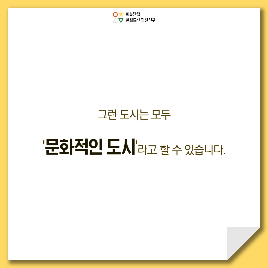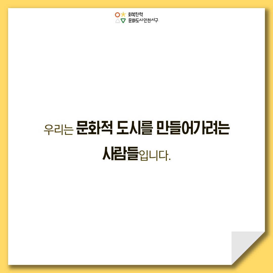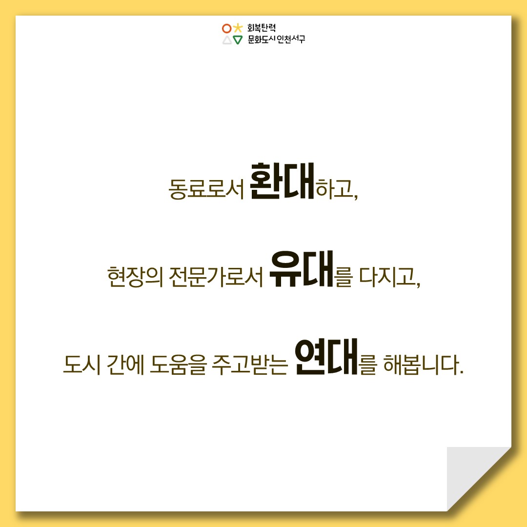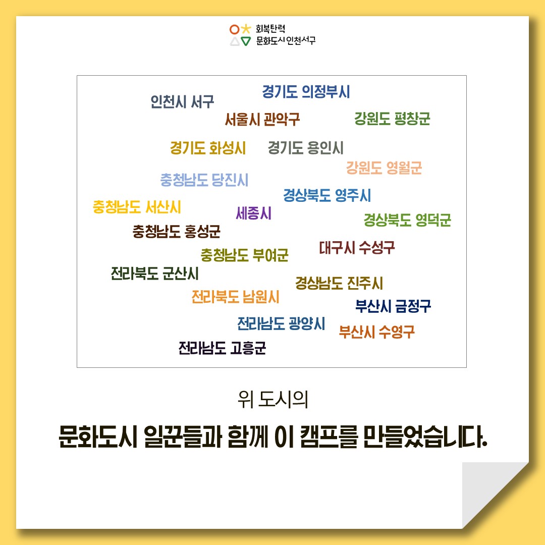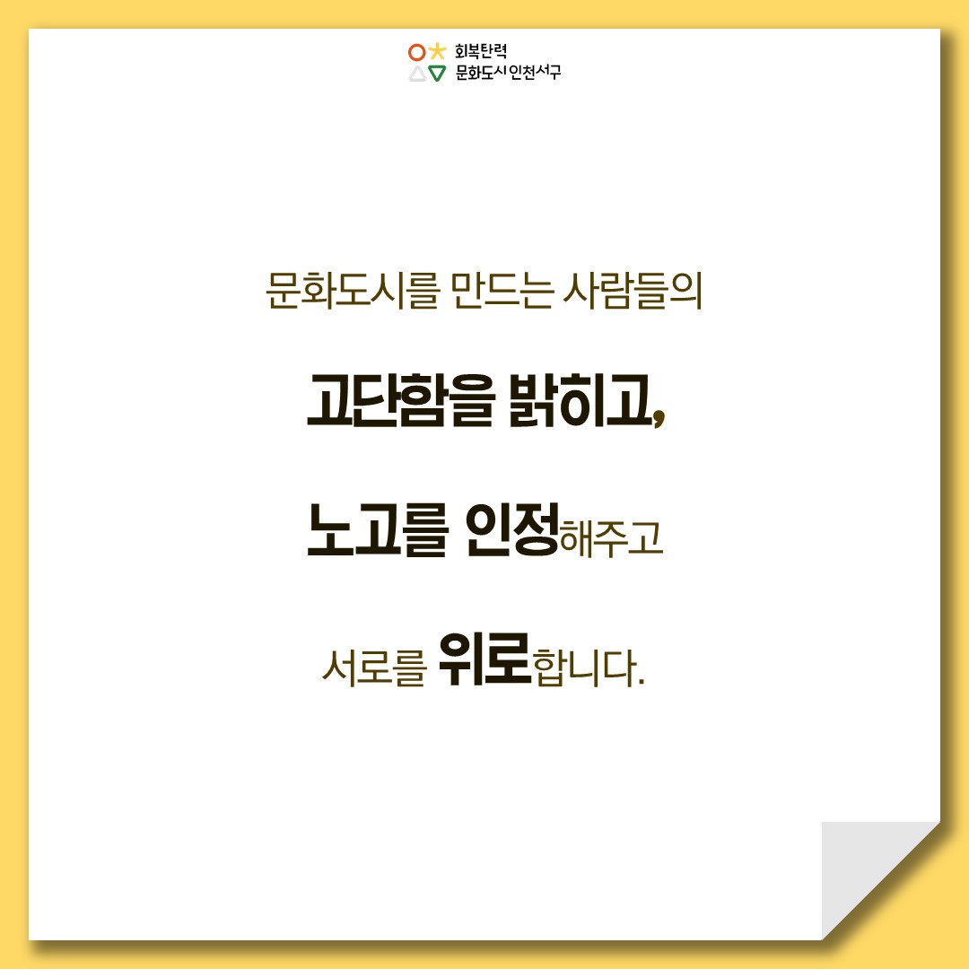 예비문화도시인 우리 인천서구는 회복탄력의 도시를 지향합니다. 지난 7월 16일에 이어, 우리는 문화도시 준비에 애쓰고 계신 각 도시 관계자들의 치유와 회복을 이야기하는 ‘인천서구 회복탄력 이야기캠프’를 19일 두 번째로 개최하였습니다. 문화도시를 준비하면서 겪은 경험과 고민, 개인의 성장에 대한 허심탄회한 이야기 마당으로 시작된 지난 행사(9개 도시, 30명의 문화도시 실무자 참여)에서의 열띤 호응을 바탕으로, 이번 두 번째 행사에는 12개 도시, 53명의 문화도시 실무자들이 한 자리에 모여 수다를 떨었습니다. 문화도시 일꾼으로서의 동료의식을 다시 한번 확인하며 부족한 시간, 과도한 업무로 지친 서로를 격려했고, 나아가 문화도시에 대한 정책적 제언을 나누며 사람이 회복하는 도시를 꿈꿔보는 시간을 가질 수 있었습니다. 할 말 많은 문화도시 일꾼들의 속풀이 잔치, ‘인천서구 회복탄력 이야기캠프’는 아쉬움을 뒤로한 채 1,2차를 마무리했습니다. 조만간 3차 이야기캠프에서 다시 뵙기를 바라며, 아래 카드뉴스(2편)으로 현장을 정리해봅니다.