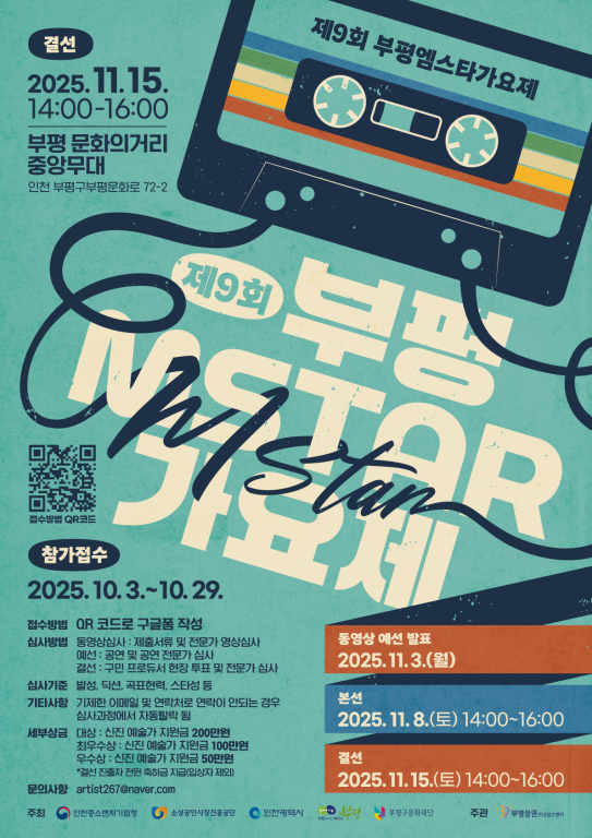 대회명제 9회 부평 M스타 가요제 참가자격자격 제한 없음 접수기간2025. 10. 03(금) ~ 2025. 10. 29(수) 까지 접수방법온라인 구글 폼 접수 (https://docs.google.com/forms/d/e/1FAIpQLScX9NRAhJMWp_wafe0Bf02U2FgV2PdFZk8i1EmVYxndgdTFRQ/viewform) 영상 업로드 방법1. SNS, 유튜브, 블로그 등에 영상 업로드 세부 일정- 동영상 예선 심사 (온라인) ㅣ 2025. 10. 3.(금)~10.29.(수) 심사방법- 동영상심사: 제출서류 및 전문가 영상심사 상금- 대상: 신진 예술가 지원금 200만원 기타 주의 사항1. 가요제에서 제공하는 장비는 스피커(메인,모니터), 마이크, 신디사이저 등 입니다. 그 외 개인 장비는 모두 지참하셔야 합니다. 문 의artist267@naver.com