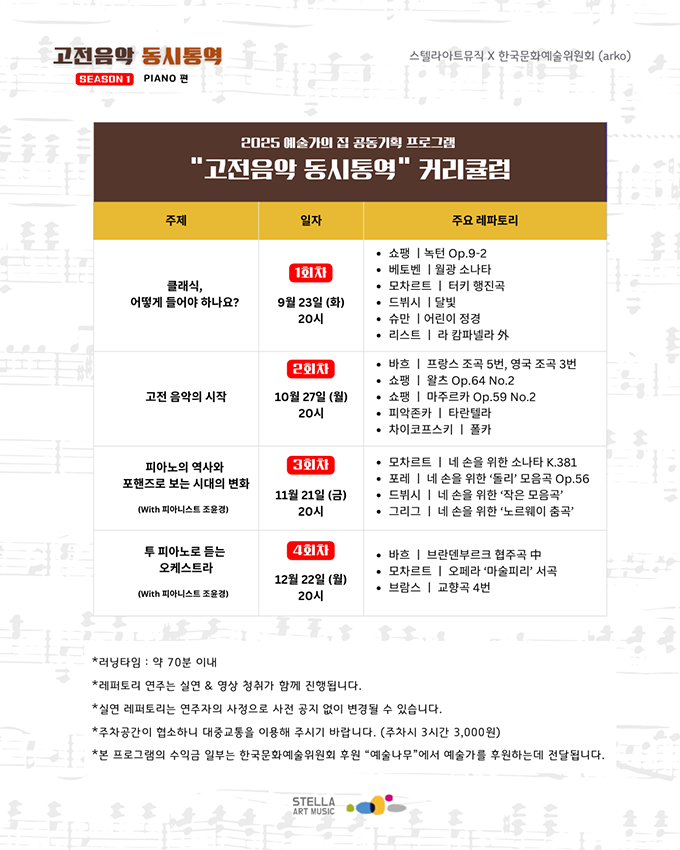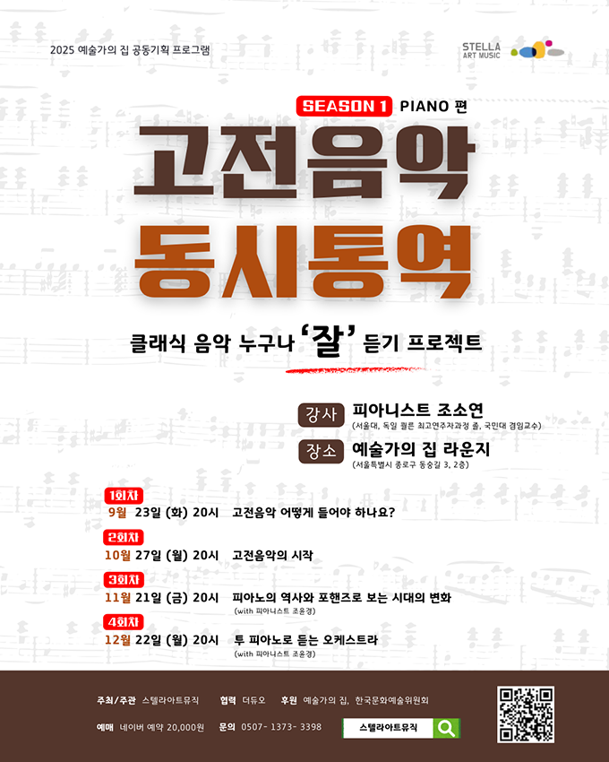 기간 2025년 9월 23일 화요일 / 2025년 10월 27일 월요일 2025년 11월 21일 금요일 / 2025년 12월 22일 월요일 장소 서울 대학로 예술가의 집 라운지 (2층) 대상 클래식 초심자 및 음악 애호가, 회차별 40명이내 (유료 20,000원) 강사 피아니스트 조소연 (1~4회차) 협력 피아니스트 조윤경 (3~4회차)