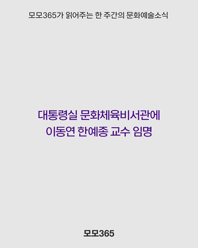 모모365가 읽어주는 한 주간의 문화예술 소식 매주 초, 모모365가 한 주간의 문화예술 소식을 엄선해 읽어드립니다! 나에게 필요한 모든 문화예술 정보, 모모365에서 편리하게 확인하세요! *본 콘텐츠는 노원문화재단 문화진흥부의 도움으로 제작하였습니다.* -기사 전문 링크- 1. 대통령실 문화체육비서관에 이동연 한예종 교수 임명 https://v.daum.net/v/20251012103103142