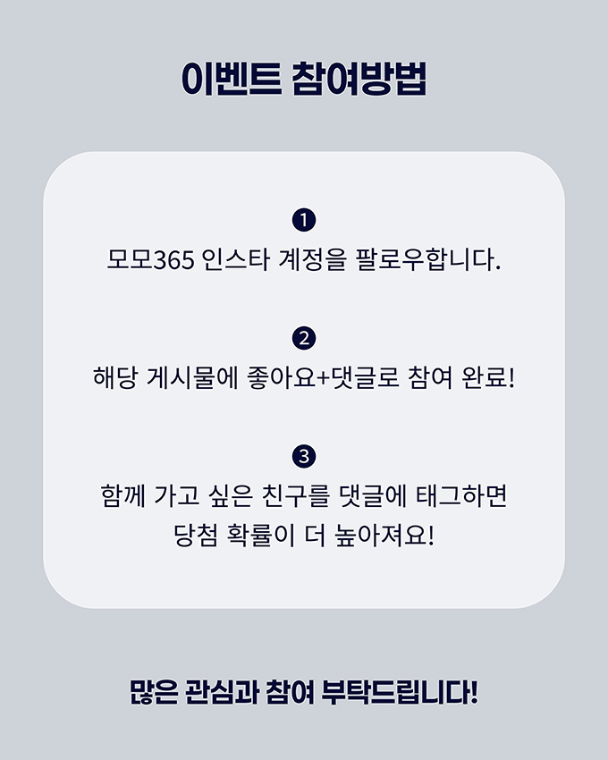 이벤트 참여 방법 1. 모모365 인스타 계정(@momo365_qx) 팔로우! 2. 본 게시물에 좋아요와 댓글을 남겨주세요. 3. 함께 가고 싶은 친구를 댓글에 태그하면 당첨 확률이 더 높아집니다!