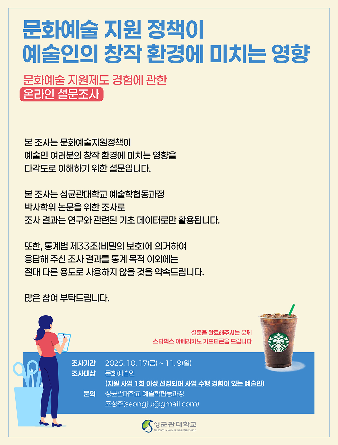 ![]() 문화예술 지원제도 경험에 관한 온라인 설문조사 참여자 모집의 글 본 설문조사는 문화예술 지원사업 및 지원제도에서 예술인 여러분이 경험하시는 과도한 행정부담에 관한 연구조사입니다. 문화예술 지원의 행정적 채찍효과를 정의하고, 제도압력 > 행정부담 > 소진 경로와 완충요인을 실증 검증하는것을 목적으로 합니다. 참여대상은 공공기관 지원사업에 1회이상 선정경험이 있는 문화예술인입니다. 설문소요시간은 약 10분이며, 각 문항에 대해 본인의 생각에 가장 가까운 응답을 체크해주시면 됩니다. 여러분의 귀한 목소리가 정책 개선을 위한 중요한 기초자료가 될 수 있도록, 잠시 시간을 내어 참여해 주시면 감사하겠습니다. 아래 [설문바로가기]를 클릭하시거나,