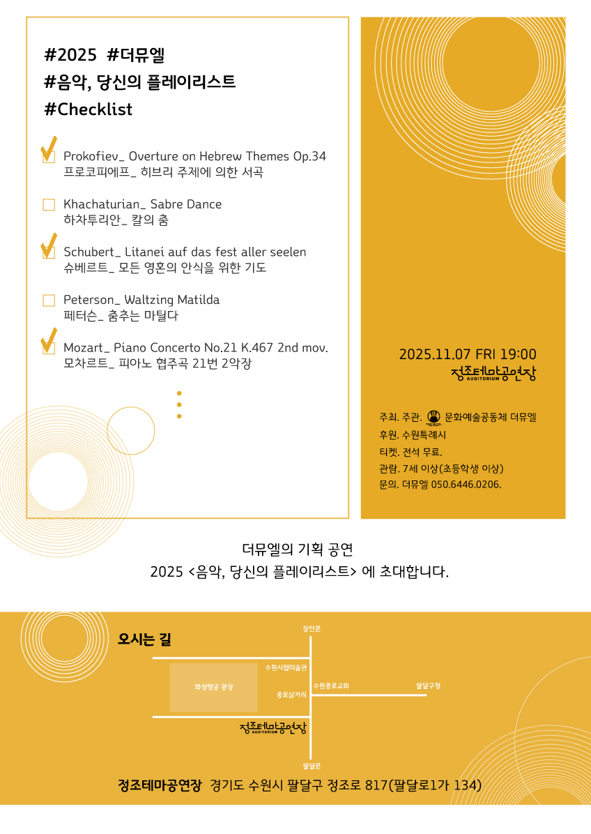 일시 : 2025.11.07 금요일 19:00 장소 : 수원 정조테마공연장 티켓 : 전석무료 신청 : https://naver.me/G5PlpWJy