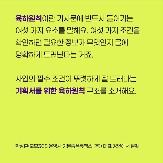 카드 뉴스! 이번엔 <육하원칙에 맞춰 기획서 작성하기>를 준비했어요. 기획서도 육하원칙에 맞춰 작성하면, 내가 말하고