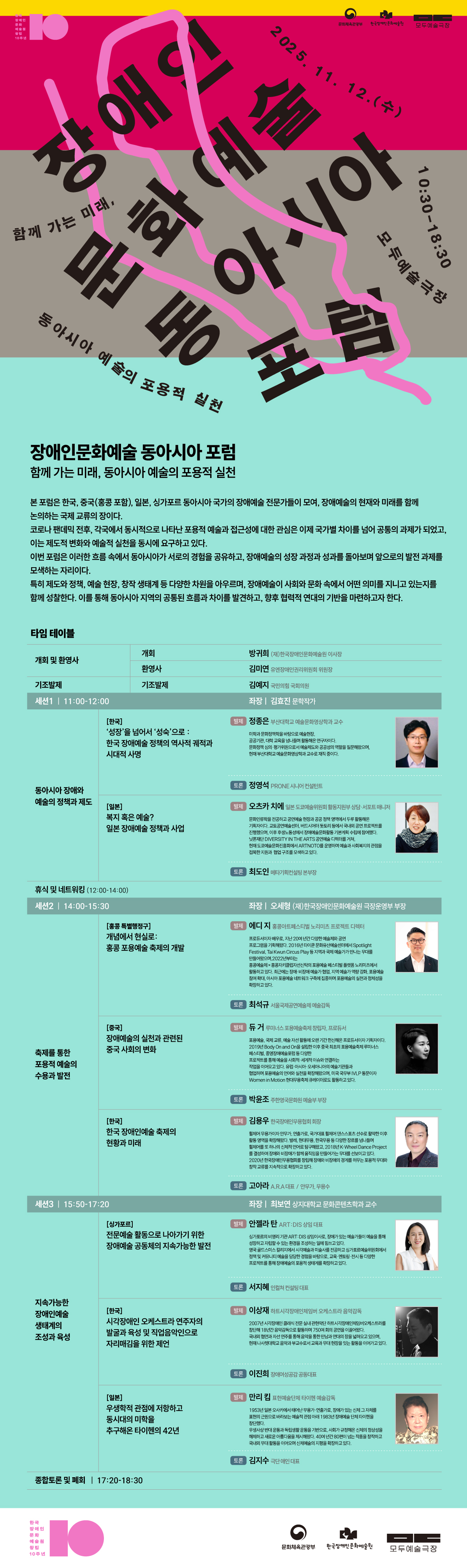 [2025 모두예술주간] 장애인문화예술 동아시아 포럼 : 함께 가는 미래, 동아시아 예술의 포용적 실천 ■ 포럼 개요 - 일시 : 2025. 11. 12.(수) 10:30-18:30 - 장소 : 모두예술극장 공연장 - 참여자 : 한국 포함 총 4개국(중국(홍콩 포함), 일본, 싱가포르) 장애와 예술 분야 전문가 - 내용 : 기조 발제 및 주제별 전문가 발표, 현장 토론 - 대상 : 국내외 장애예술인, 장애예술 종사자 및 전문가, 예비종사자 등 ■ 포럼 소개 본 포럼은 한국, 중국(홍콩 포함), 일본, 싱가포르 등 동아시아 국가의 장애예술 전문가들이 모여, 장애예술의 현재와 미래를 함께 논의하는 국제 교류의 장이다. 코로나 팬데믹 전후, 각국에서 동시적으로 나타난 포용적 예술과 접근성에 대한 관심은 이제 국가별 차이를 넘어 공통의 과제가 되었고, 이는 제도적 변화와 예술적 실천을 동시에 요구하고 있다. 이번 포럼은 이러한 흐름 속에서 동아시아가 서로의 경험을 공유하고, 장애예술의 성장 과정과 성과를 돌아보며 앞으로의 발전 과제를 모색하는 자리이다. 특히 제도와 정책, 예술 현장, 창작 생태계 등 다양한 차원을 아우르며, 장애예술이 사회와 문화 속에서 어떤 의미를 지니고 있는지를 함께 성찰한다. 이를 통해 동아시아 지역의 공통된 흐름과 차이를 발견하고, 향후 협력적 연대의 기반을 마련하고자 한다. ■ 신청 안내 - 모집기간 : 2025. 11. 10.(월) 17:00까지 - 문의 : 02-2651-2515 - 링크 : https://docs.google.com/forms/d/e/1FAIpQLSffvYQwBK3_N3TI8YLQacO3zAnMl1W5jg5HK3Aoft3UtmtMTw/viewform ■ 유의사항 - 본 포럼은 비지정석으로 운영됩니다. - 사진 및 영상 촬영이 진행되며, 추후 홍보 영상으로 활용될 예정입니다. - 한-영 동시통역이 제공되며, 일부 연사에 한해서는 추가 언어 통역이 순차 통역으로 제공될 수 있습니다. - 휠체어석, 수어통역, 문자통역 등 접근성 지원이 마련되어 있습니다. - 주차 공간이 협소하오니 가능한 대중교통을 이용해 주시기 바랍니다.