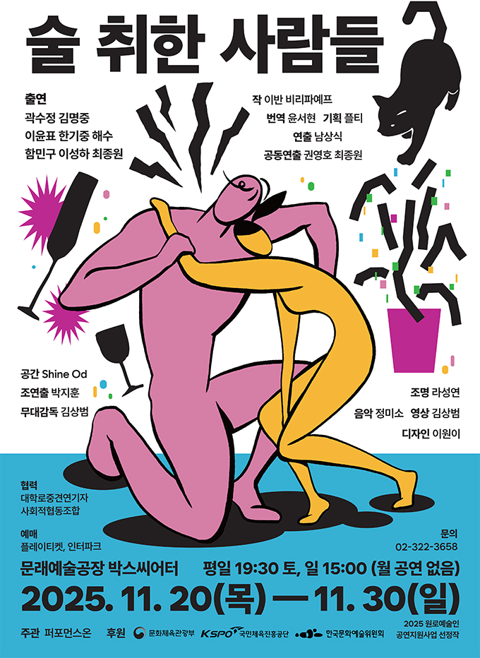 술 취한 사람들 2025. 11. 20(목) - 11. 30(일) 평일 19:30 / 토, 일 15:00 (월 공연 없음) 문래예술공장 박스씨어터