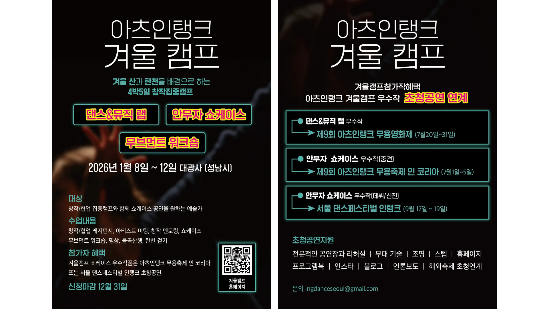 ❄️2026 아츠인탱크 겨울캠프 참가자 모집❄️ 무용·음악 창작 협업 프로그램 2026 아츠인탱크 - 겨울 캠프가 1월 성남에서 열립니다. 아츠인탱크 겨울캠프는 4박 5일 동안 국내외 창작자들이 함께 창작에 집중하며 움직임과 음악의 관계를 탐구하는 무브먼트 워크숍 · 멘토링 · 레지던시 기반의 창작 프로그램입니다. 창작 과정에서 새로운 방향을 찾고 싶은 무용가, 음악가, 안무가 여러분의 많은 관심과 참여를 바랍니다.