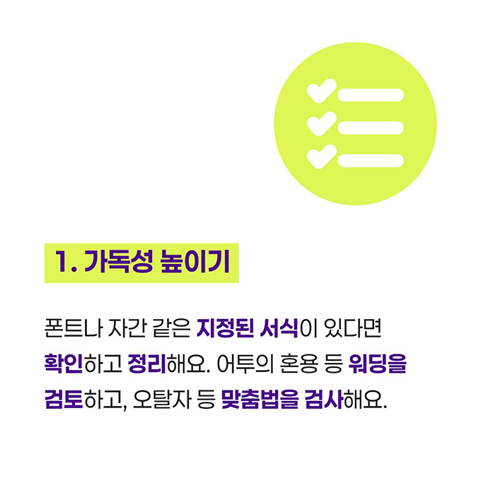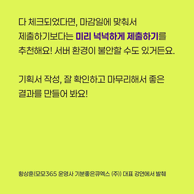 기획서 완성! 200%로 끌어올리는 체크 포인트 5가지 한 해의 사업이 마무리되고 다시 #기획서 를 쓰는 시즌이 돌아왔어요. 쓰면서 어느 부분을 놓치고 있는지, 어디를 보완해야 할지 막막할 때가 있지 않으신가요? 그런 분들을 위해 준비한 모모365의 기획서 쓰기 카드 뉴스! 이번엔 <기획서 완성! 200%로 끌어올리는 체크 포인트 5가지>를 준비했어요. 기획서는 작성도 중요하지만, 확인해서 잘 마무리하는 것도 중요하다는 사실! 기획서 제출 전 체크해야 할 5가지 포인트를 소개합니다. 기획서 작성 콘텐츠는 꾸준히 업로드될 계획이니 모모365와 함께 기획서를 작성해 봐요! ![]() ![]() ![]() ![]() ![]() ![]() ![]() ![]() ![]()