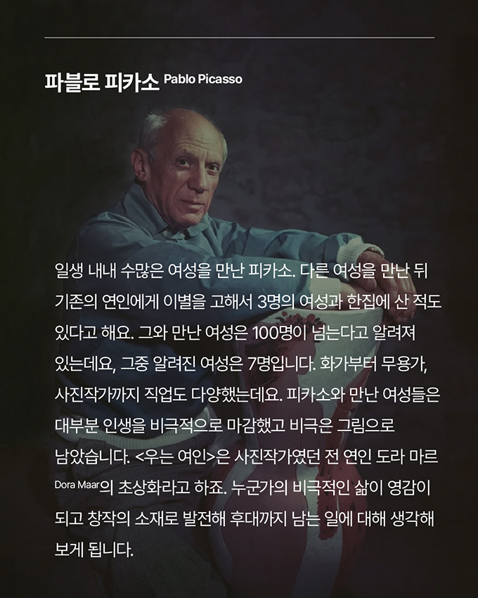 조금은 복잡한 예술가들의 불량연애 면도날, 달과 6펜스 등을 쓴 영국의 작가 윌리엄 서머싯 몸은 "예술과 사랑을 하기에는 인생이 짧다”라는 말을 남길 정도로 사랑은 예술가들의 영감의 원천이 되었는데요. 영감의 욕구가 너무나도 강렬했던 걸까요? 최근 이슈가 된 넷플릭스의 리얼리티 시리즈 <불량 연애>에 나오는 출연자들처럼, 조금은 복잡한 예술가들의 불량 연애(?)를 살펴봤어요.