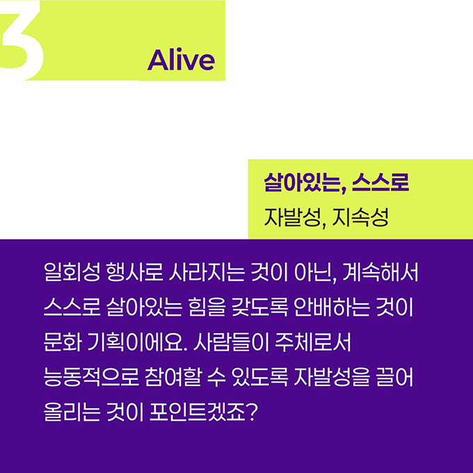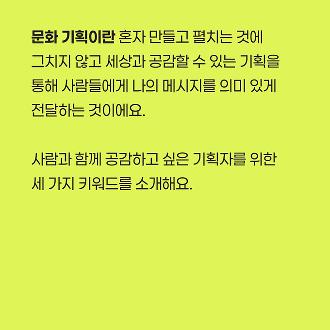 가장 가까운 일상에서부터 기획력을 키울 수 있는 방법은 문화 기획적 관점으로 세상을 바라보는 것! 이번에는 세상과 공감하고 싶은 기획자를 위한 세 가지 키워드를 준비했어요.
