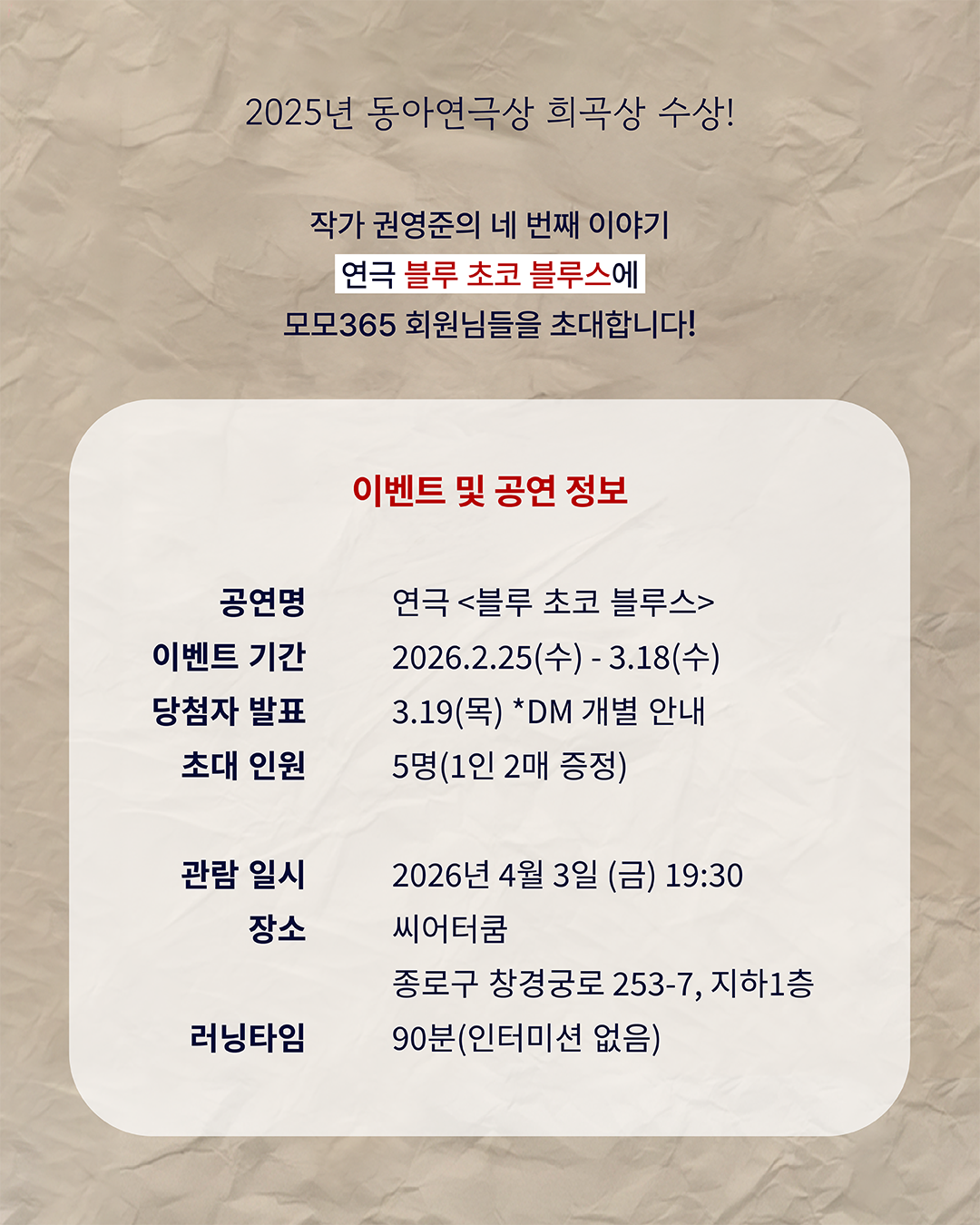 ![]() 모모365와 함께하는 연극 <블루 초코 블루스> 초대권 증정 이벤트 2025 동아연극상 희곡상 수상! 작가 권영준의 네 번째 이야기 연극 <블루 초코 블루스>에 모모365 회원님들을 초대합니다! 이벤트 정보 이벤트 기간: 2026.2.25(수) - 3.18(수) 당첨자 발표: 3월 19일 (목) 인스타 DM 개별 연락 초대 인원: 5명(1인 2매 증정) 관람 일시: 4월 3일 (금) 19:30 공연 장소: 씨어터쿰 (4호선 혜화역 4번 출구, 도보 4분) 참여 방법 2. 본 게시물에 [좋아요] 누르고 스토리 공유해 주세요. 3. 함께 갈 친구를 태그하고 본 게시물에 [공유 완료] 댓글을 남겨주세요. *본 공연은 만19세이상 관람가로 티켓 수령시 연령 증빙 자료를 요청할 수 있습니다. *비공개 계정은 당첨이 제한될 수 있습니다. 많은 참여 부탁드립니다. 감사합니다! #모모365 #이벤트 #티켓이벤트 #동아연극상 #블루초코블루스 #씨어터쿰 #인스타이벤트 #티켓이벤트 #댓글이벤트 #리플이벤트 #초대이벤트 #SNS이벤트 #공연추천 #연극추천 #대학로공연 #대학로연극 #대학로데이트 #대학로연극추천 ![]() ![]() ![]() ![]() ![]()