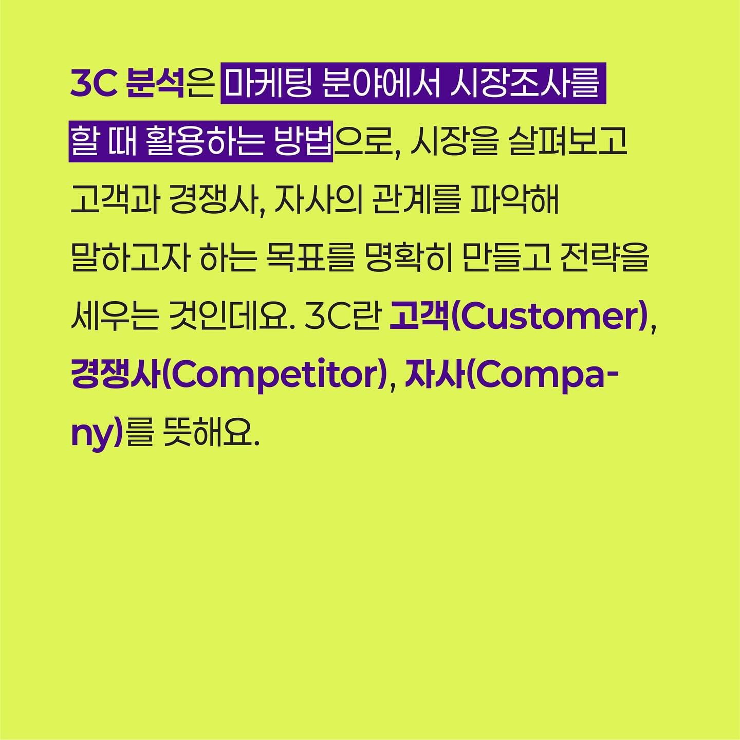 3C 분석은 마케팅 분야에서 시장조서를 할 때 활용하는 방법으로, 시장을 살펴보고 고객과 경쟁사, 자사의 관계를 파악해 말하고자 하는 목표를 명확히 만들고 전략을 세우는 것입니다. 3C란 고객(Customer), 경쟁사(Competitor), 자사(Company)를 뜻해요.