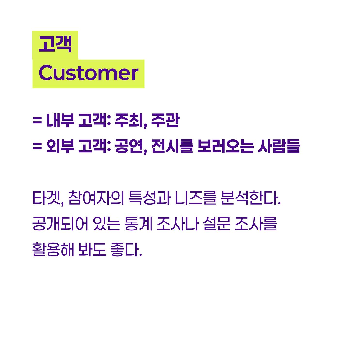 1. 고객 Customer 내부 고객 : 주최, 주관 / 외부 고객 : 공연, 전시를 보러오는 사람들 타겟, 참여자의 특성과 니즈를 분석한다. 공개되어 있는 통계 조사나 설문 조사를 활용해 봐도 좋다.