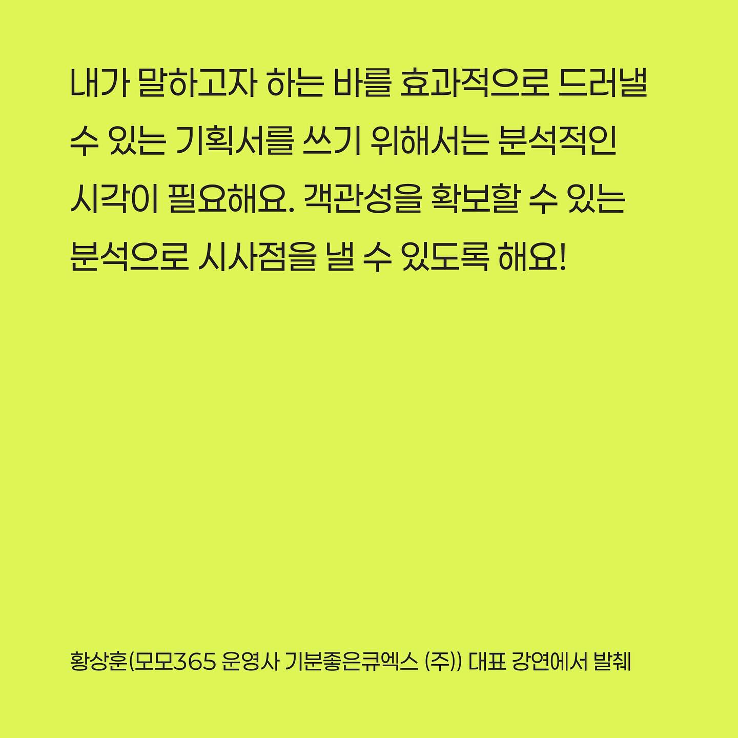 내가 말하고자 하는 바를 효과적으로 드러낼 수 있는 기획서를 쓰기 위해서는 분석적인 시각이 필요해요. 객관성을 확보할 수 있는 분석으로 시사점을 낼 수 있도록 해요!