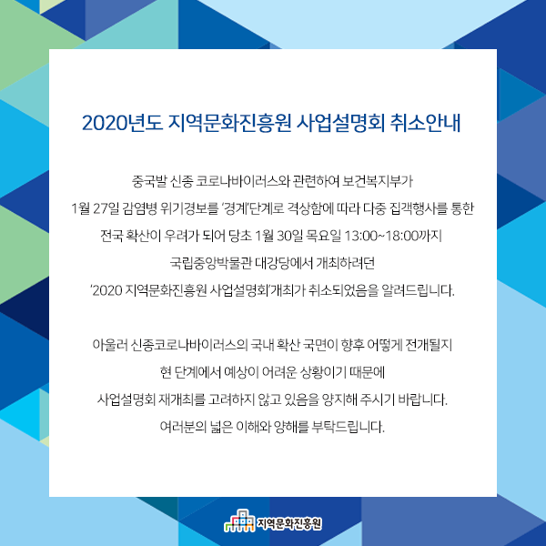 중국발 신종 코로나바이러스와 관련하여 보건복지부가 1월 27일 감염병 위기경보를 ‘경계’단계로 격상함에 따라 다중 집객행사를 통한 전국 확산이 우려가 되어 당초 1월 30일 목요일 13:00~18:00까지 국립중앙박물관 대강당에서 개최하려던 ‘2020 지역문화진흥원 사업설명회’개최가 취소되었음을 알려드립니다.