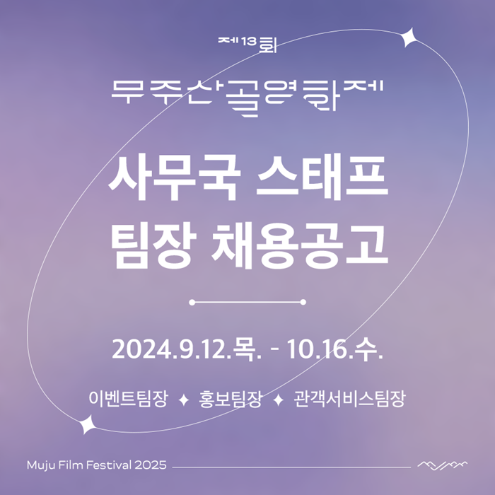 2025년 ‘제13회 무주산골영화제’를 새롭게 이끌어갈 사무국 스태프(팀장)를 모집합니다. 낭만 가득한 초여름의 영화축제를 함께 만들어 나갈 다양한 인재들의 많은 지원을 기다립니다.