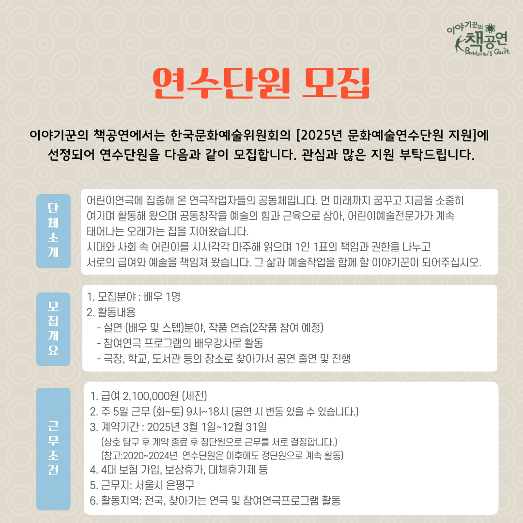 [이야기꾼의 책공연] 2025년 배우작업자 모집 (예술단체 연수단원 지원사업)