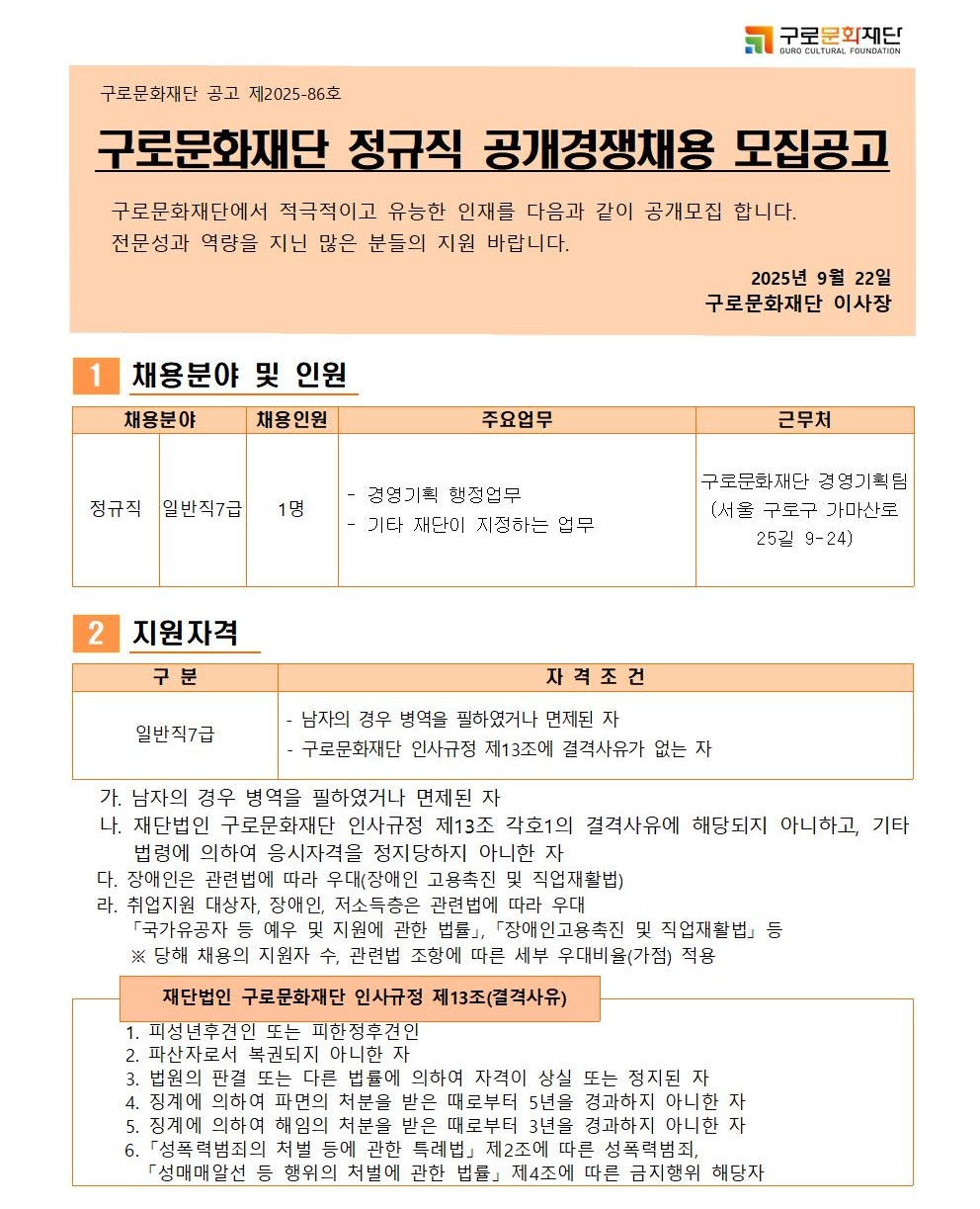 [구로문화재단] 구로문화재단 정규직 공개경쟁채용 모집공고