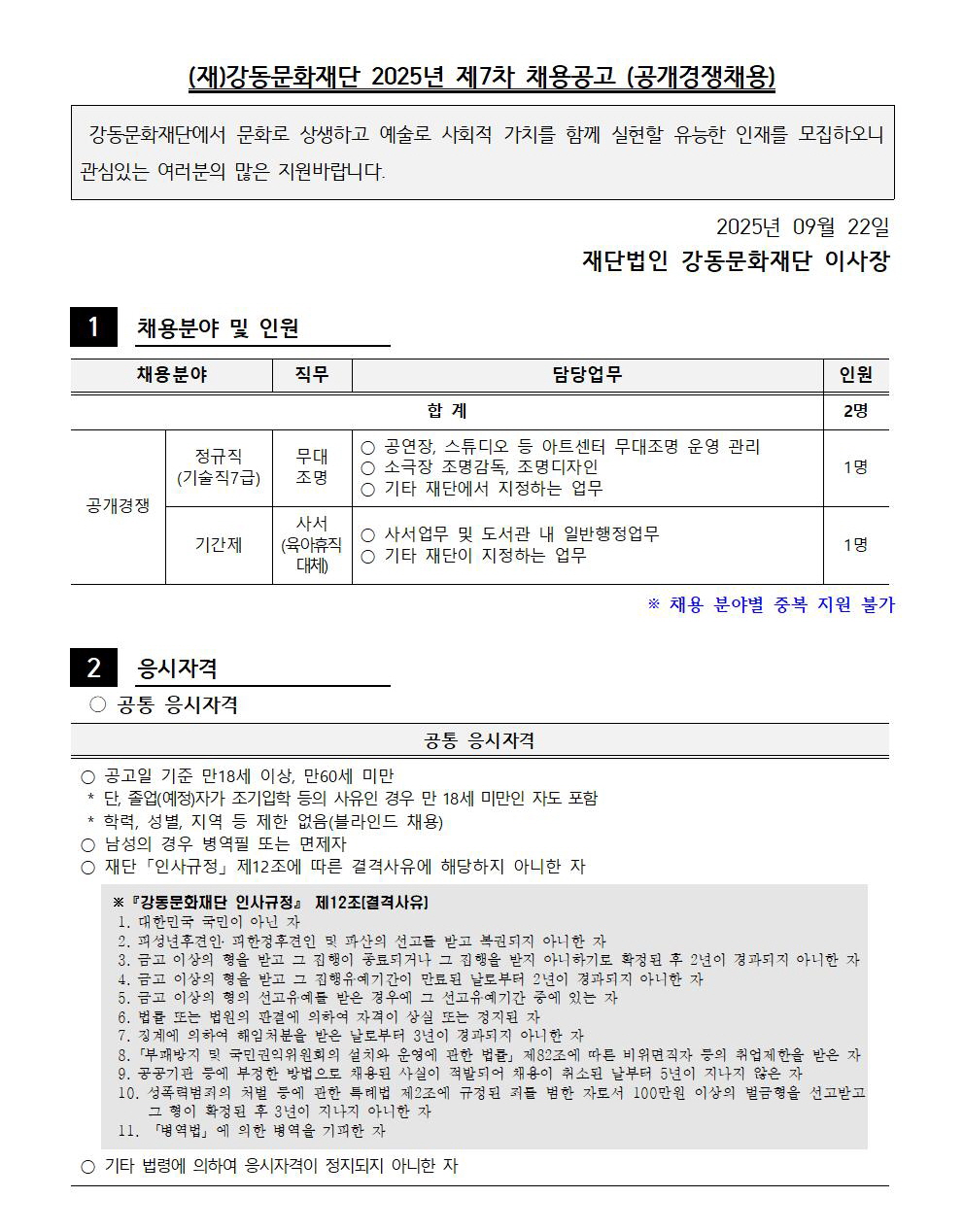 [아트모아] (재)강동문화재단 2025년 제7차 채용공고 (공개경쟁채용)