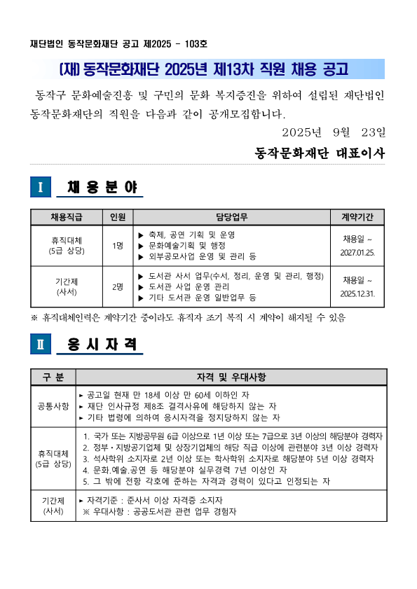 [(재)동작문화재단] 2025년 제13차 직원 채용 공고