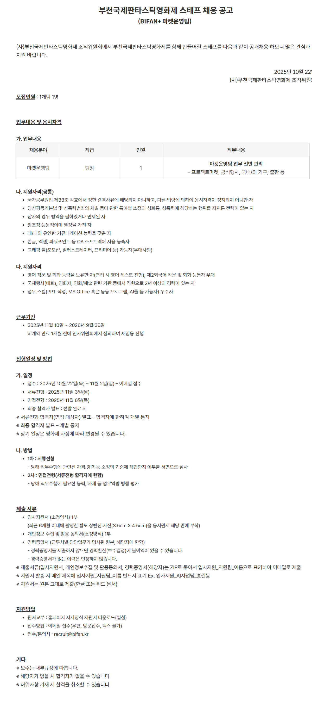 [부천국제판타스틱영화제] 부천국제판타스틱영화제 (BIFAN+ 마켓운영팀장) 채용