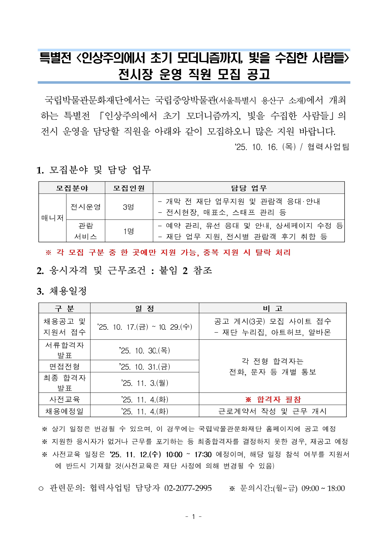 [국립박물관문화재단] 국립중앙박물관 특별전 전시장 운영 매니저 모집