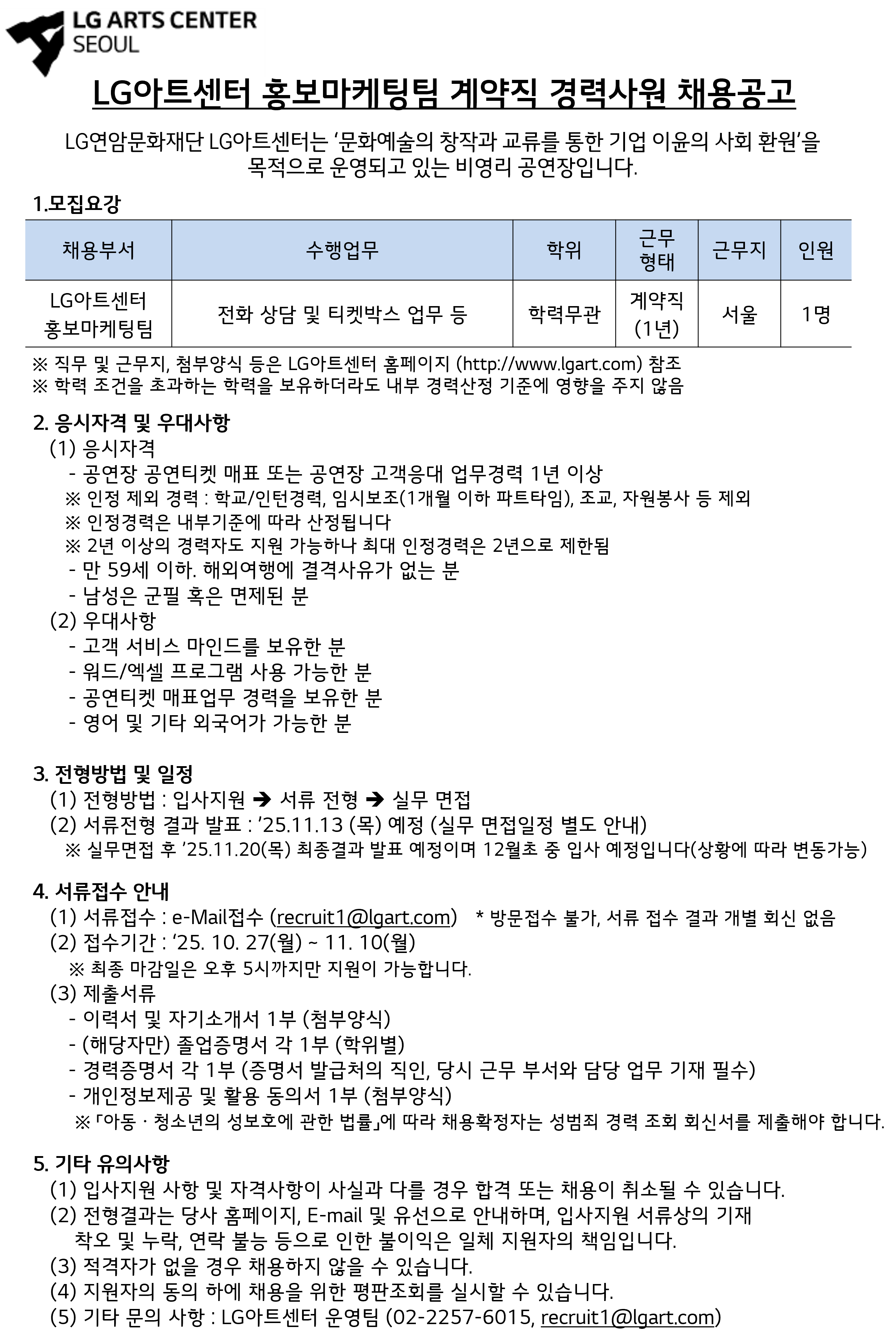 [엘지연암문화재단] LG아트센터 홍보마케팅팀(티켓박스) 계약직 경력사원 채용공고
