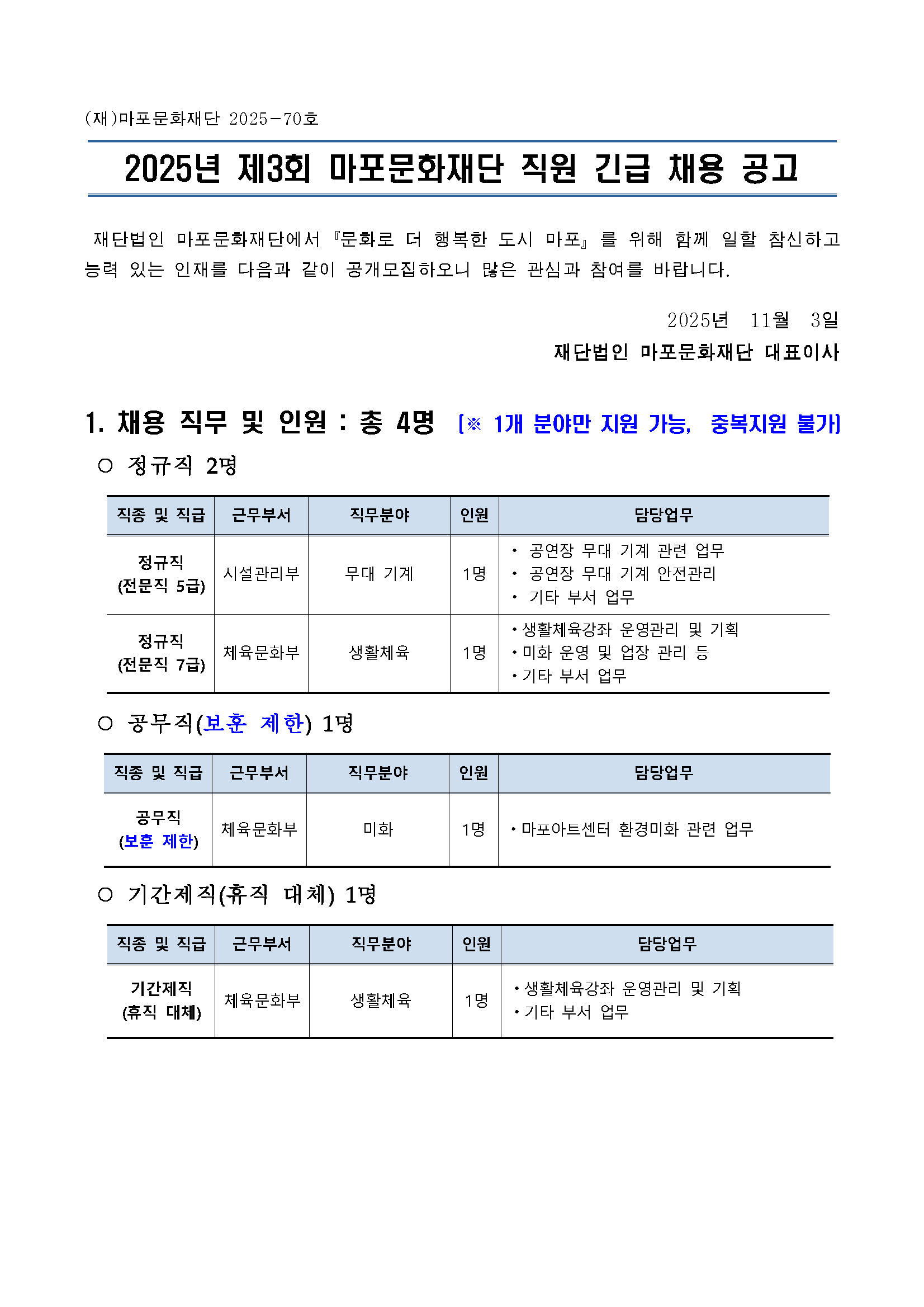 [마포문화재단] 2025년 제3회 마포문화재단 직원 긴급 채용 공고 (~11.13.(목) 18:00 한)