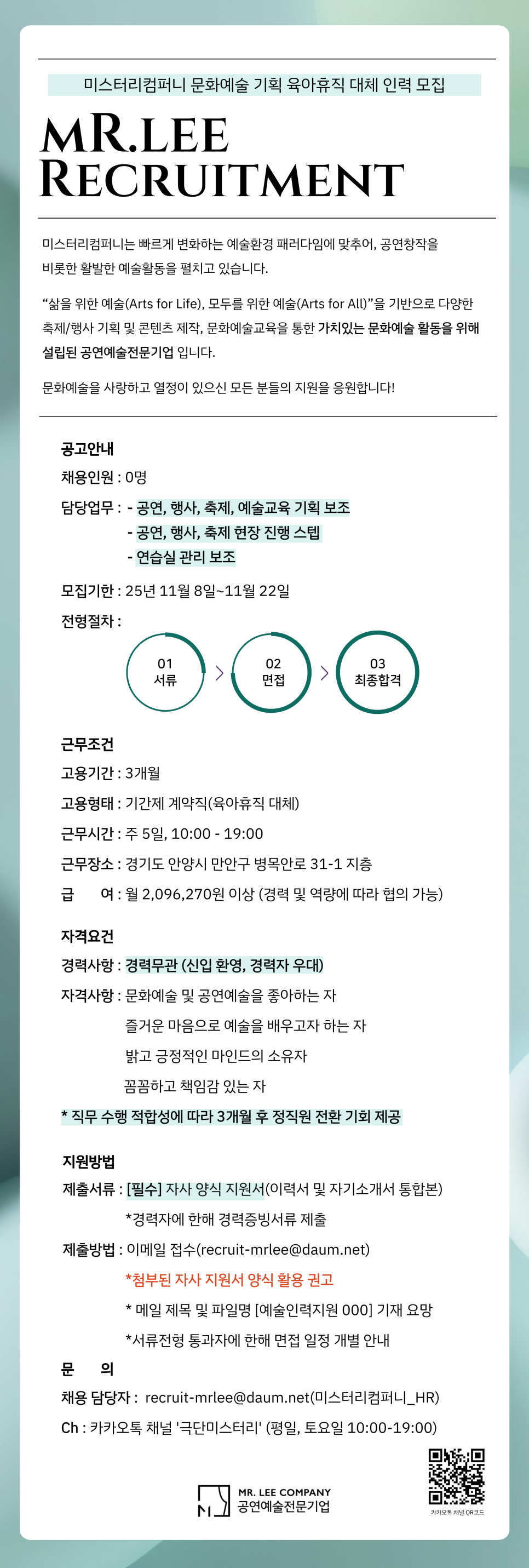 [미스터리컴퍼니] [미스터리컴퍼니] 문화예술기획 육아휴직 대체 인력 모집