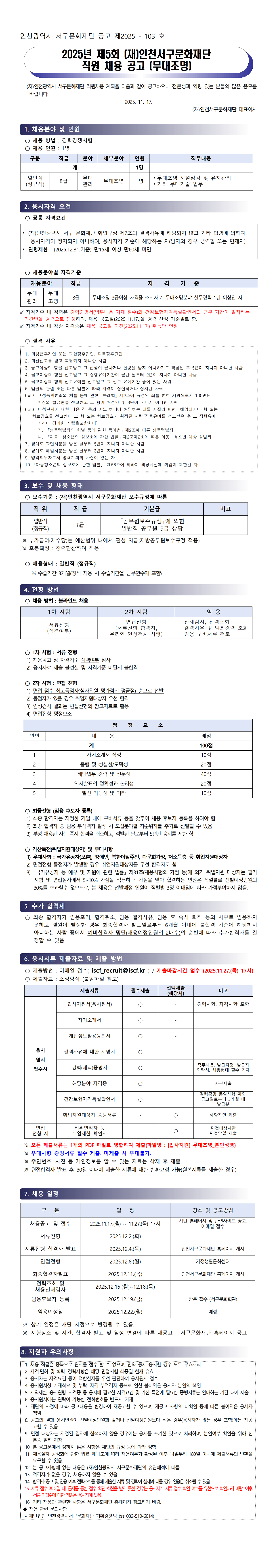 2025년 제8회 인천서구문화재단 직원 채용 공고(하우스매니저)