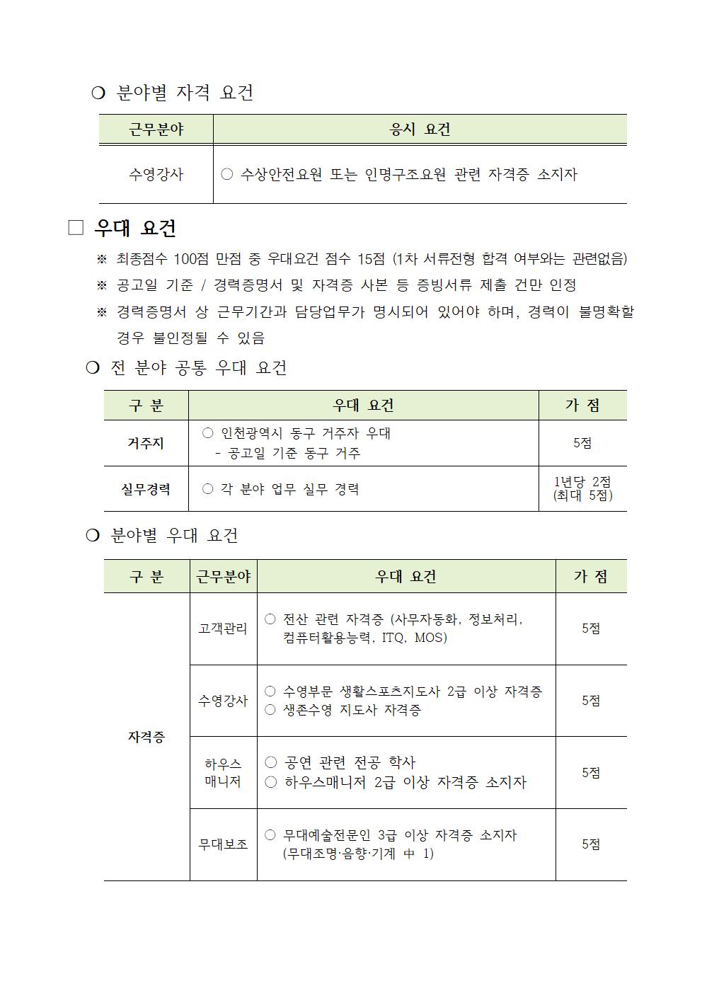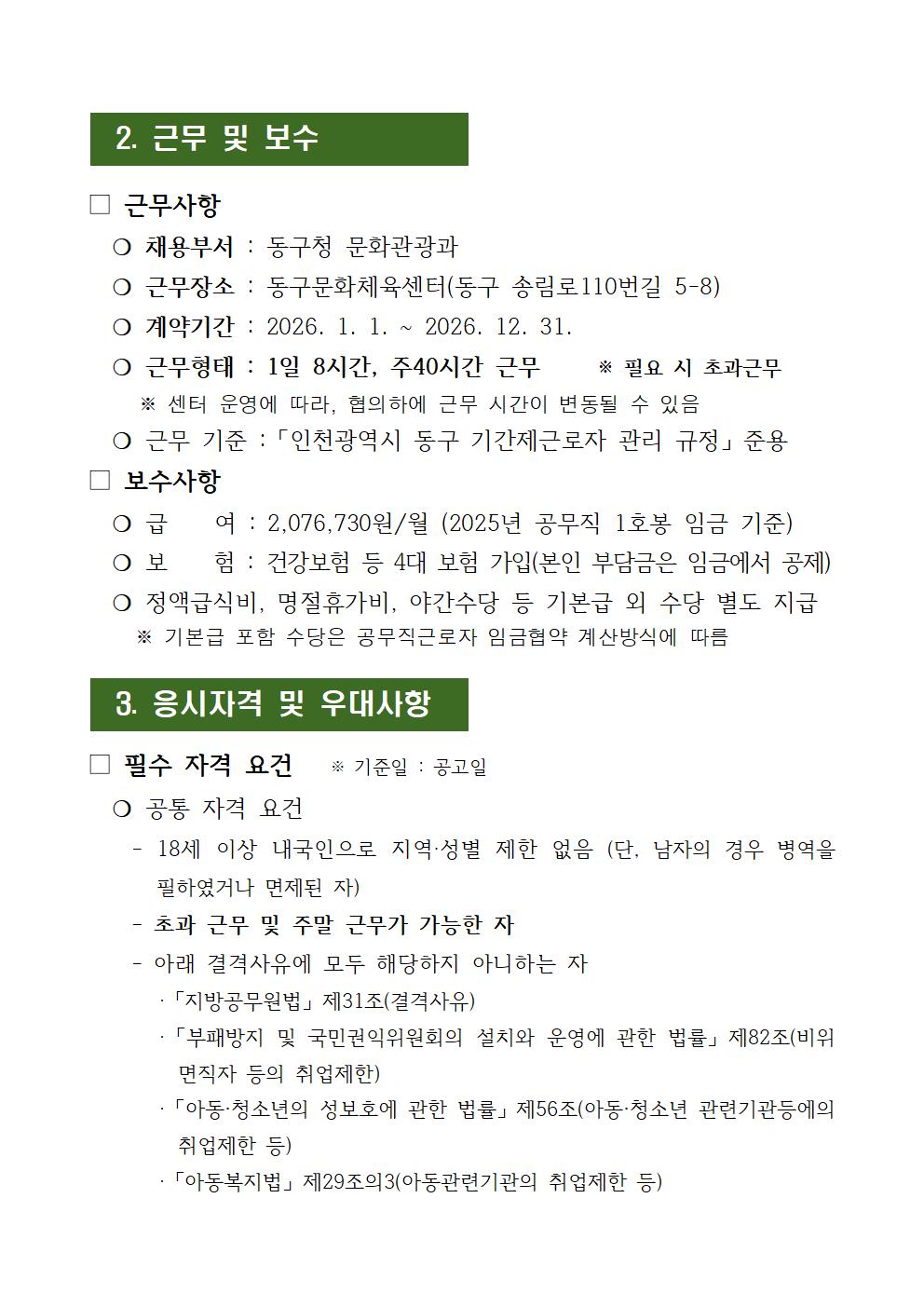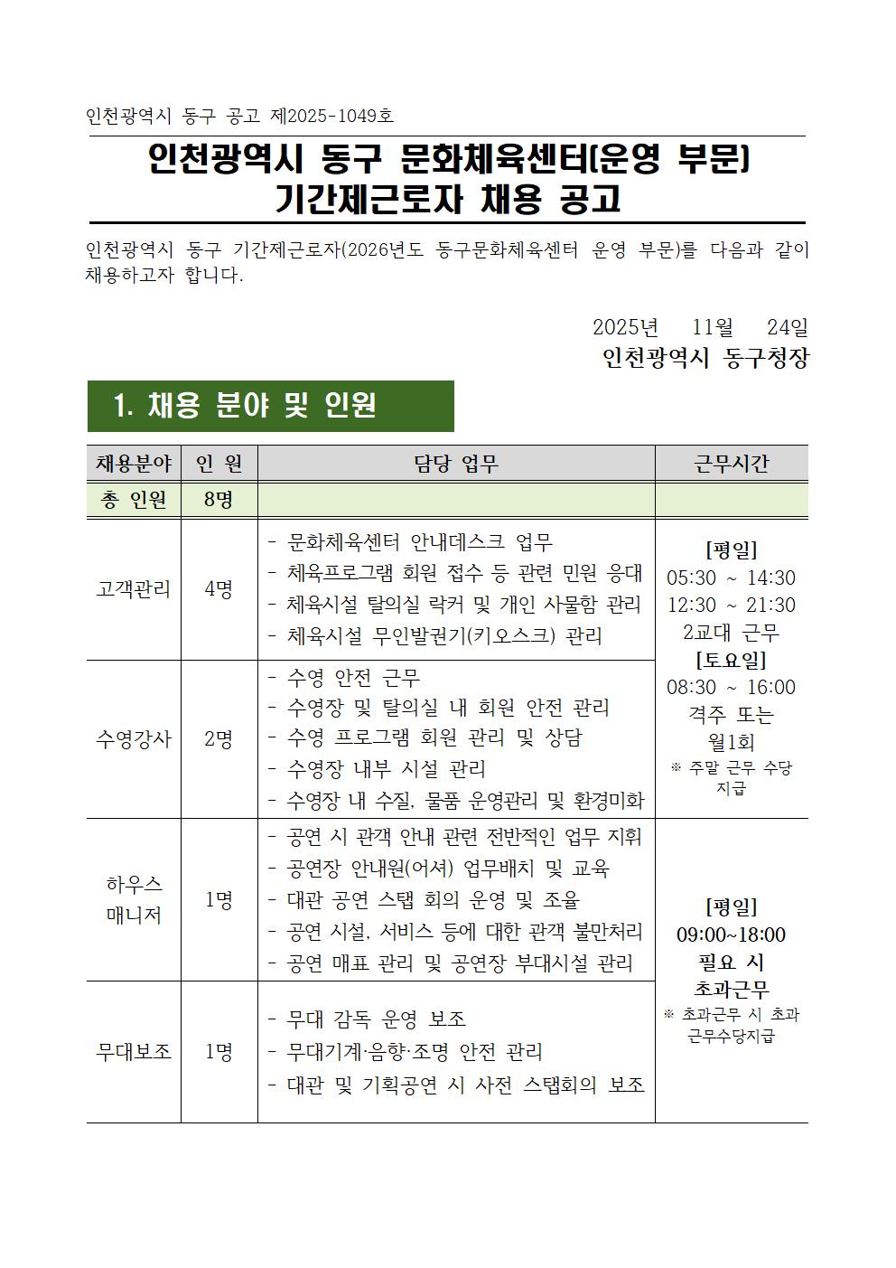 [인천동구청(동구문화체육센터)] 인천광역시 동구 문화체육센터(운영 부문) 기간제근로자 채용 공고