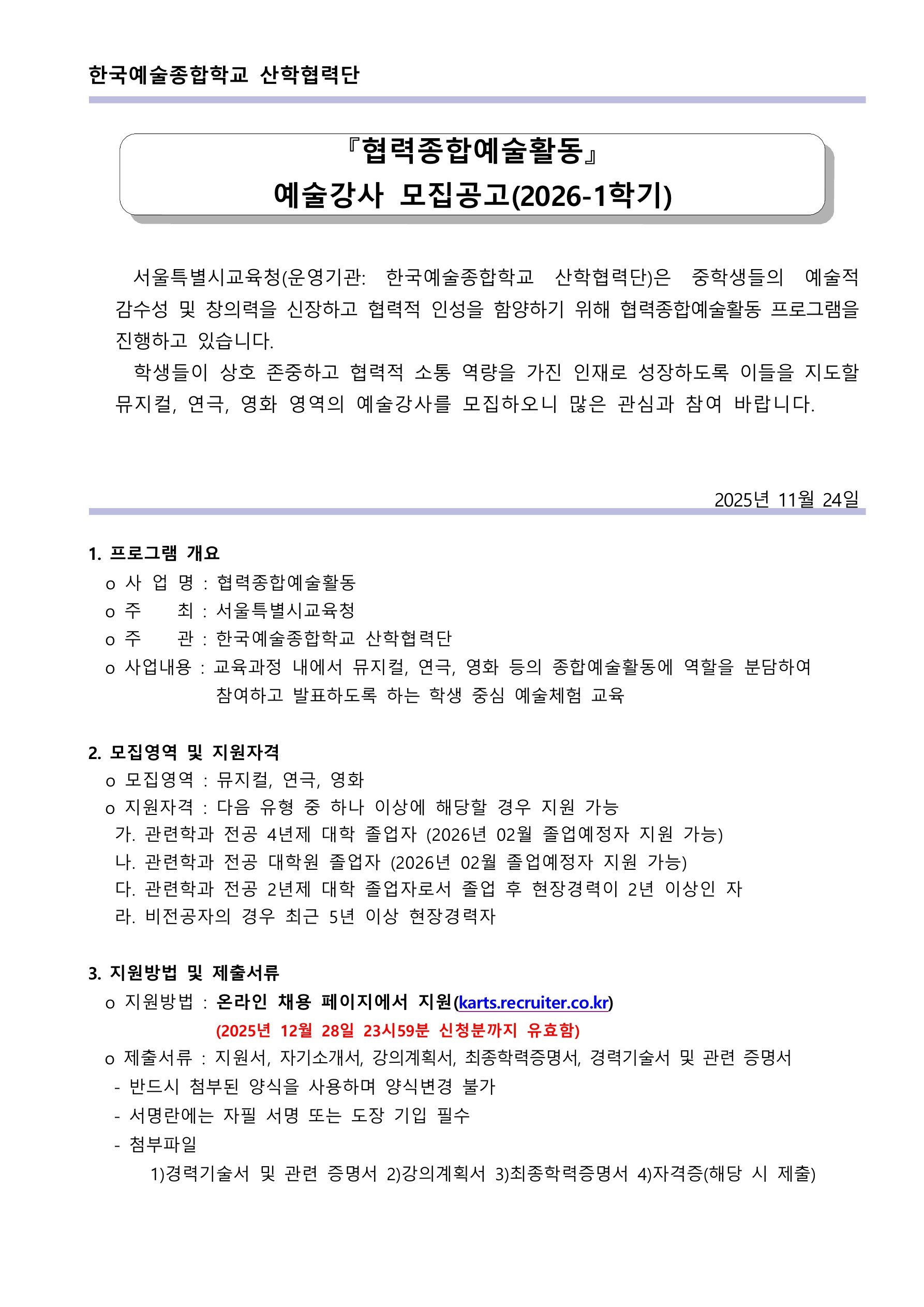 [한국예술종합학교 산학협력단] [한국종합예술학교 산학협력단] 2026-1학기 협력종합예술활동 예술강사 모집공고