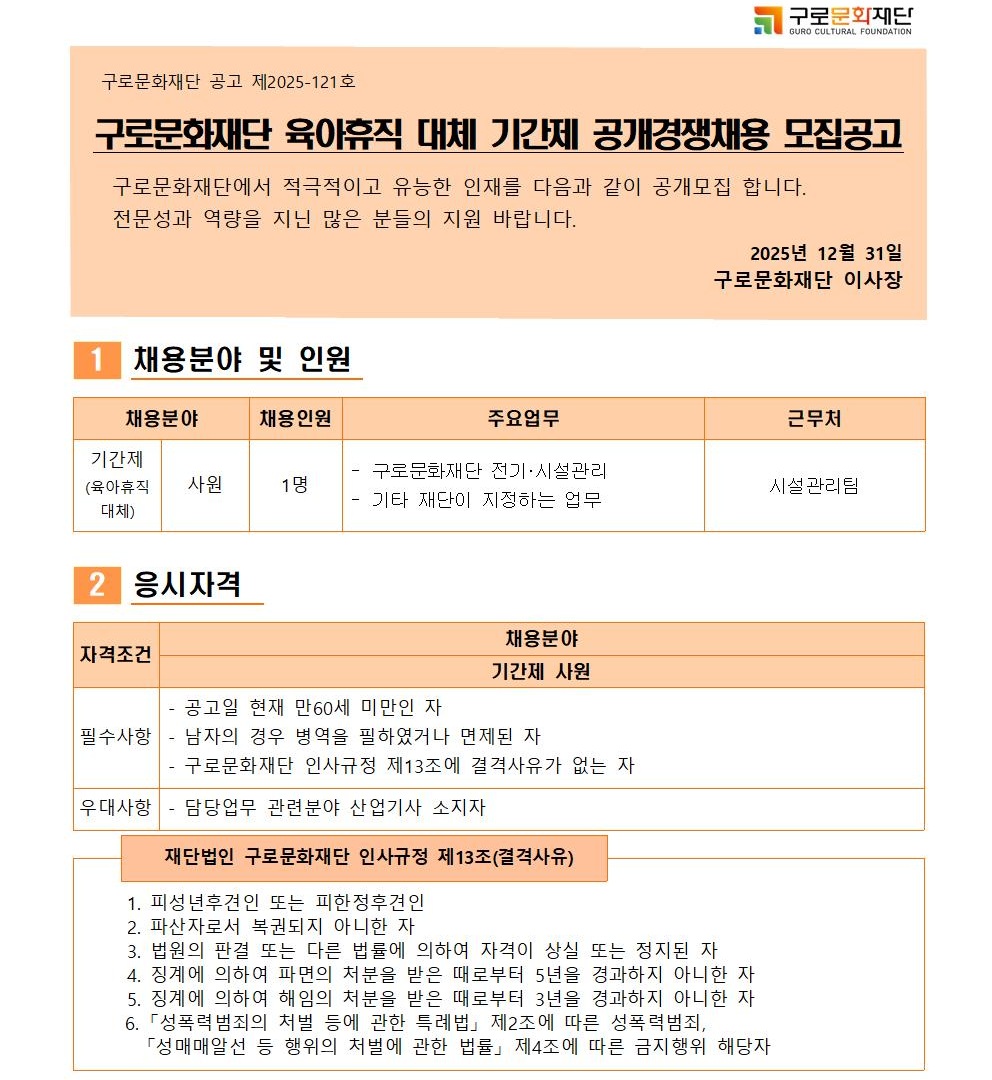 [구로문화재단] 구로문화재단 육아휴직 대체 기간제 공개경쟁채용 모집공고