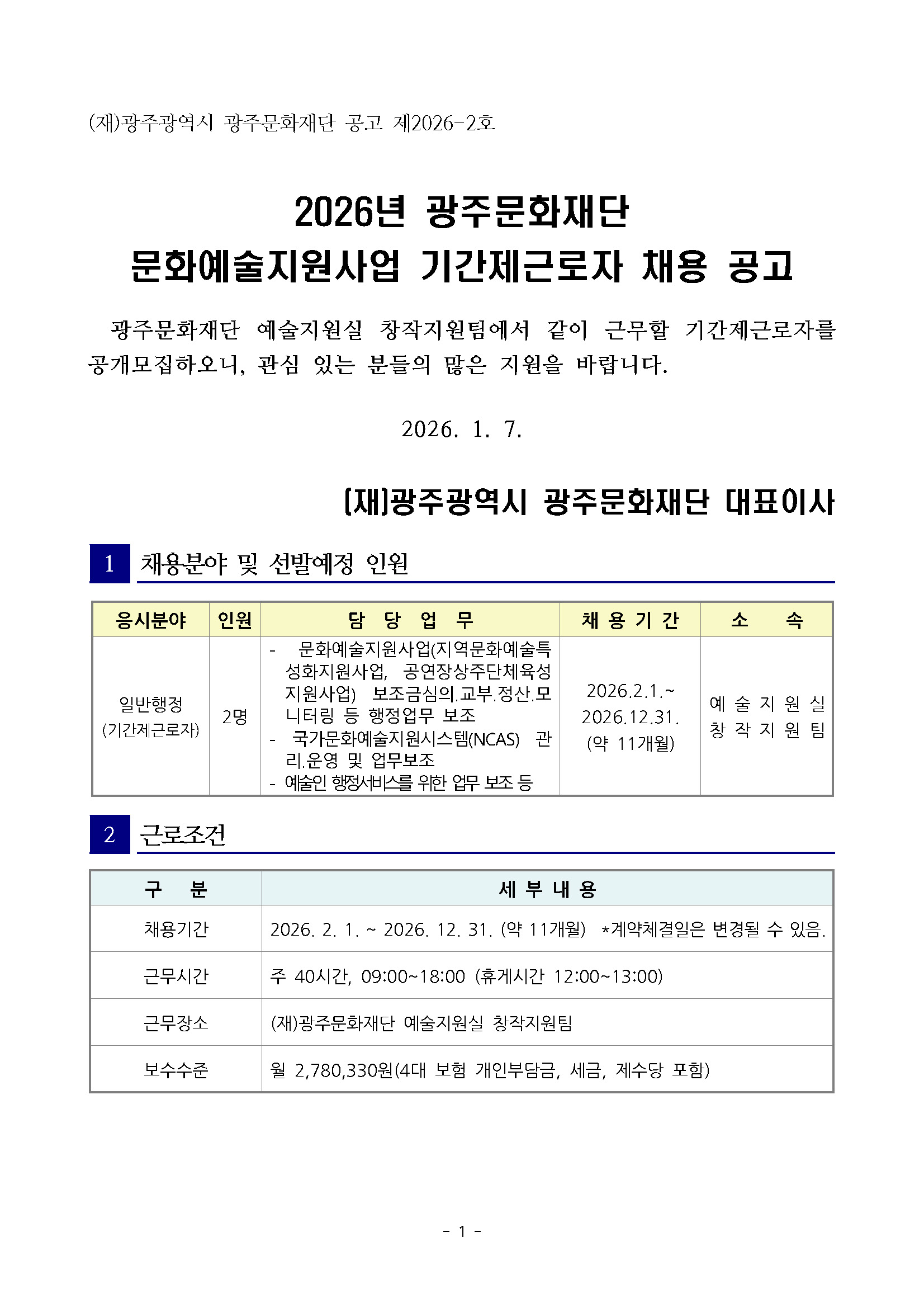 [광주문화재단] 2026년 광주문화재단 문화예술지원사업 기간제근로자 채용 공고