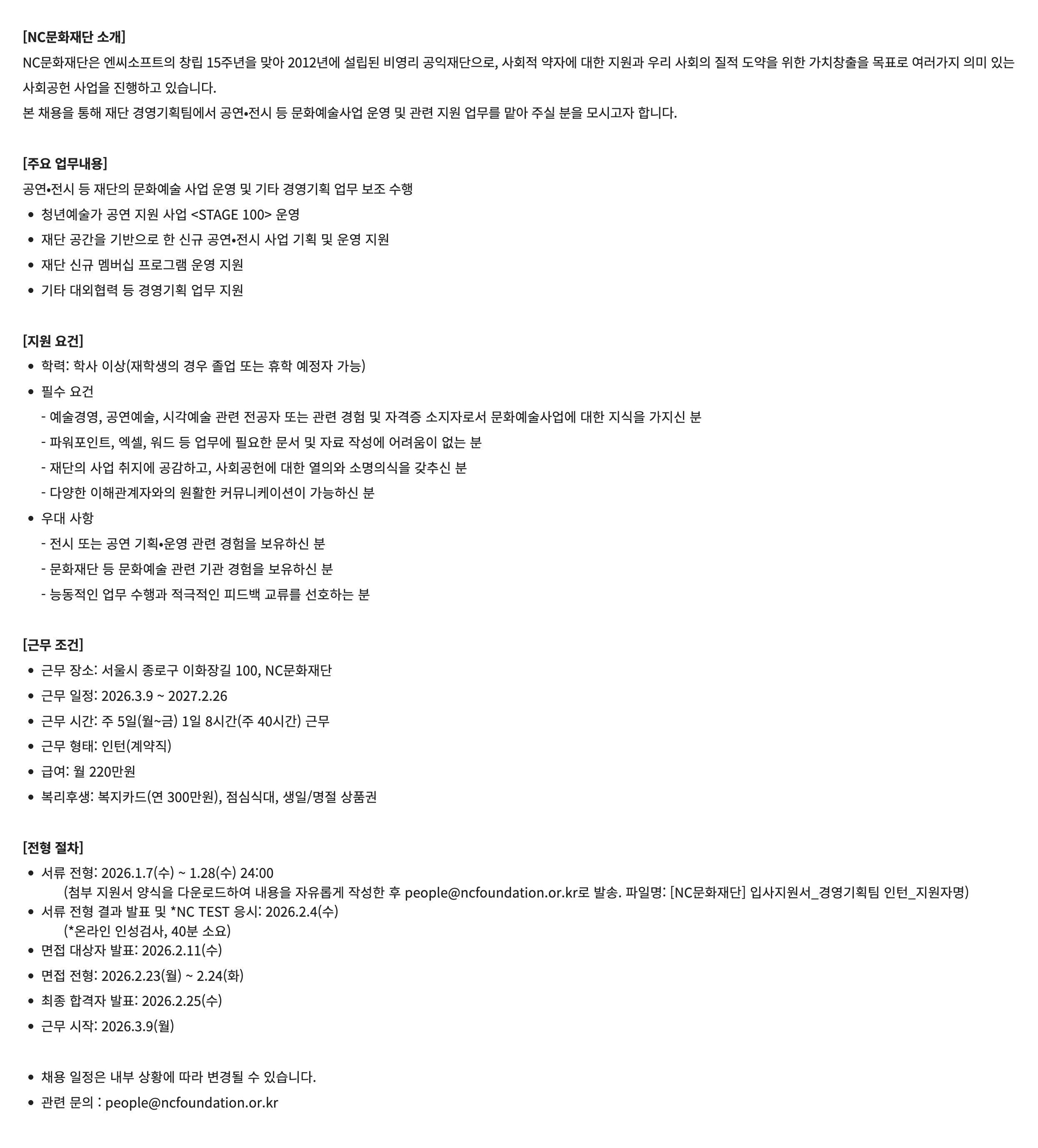 [재단법인 엔씨문화재단] [NC문화재단] 경영기획팀 문화예술사업 인턴 모집