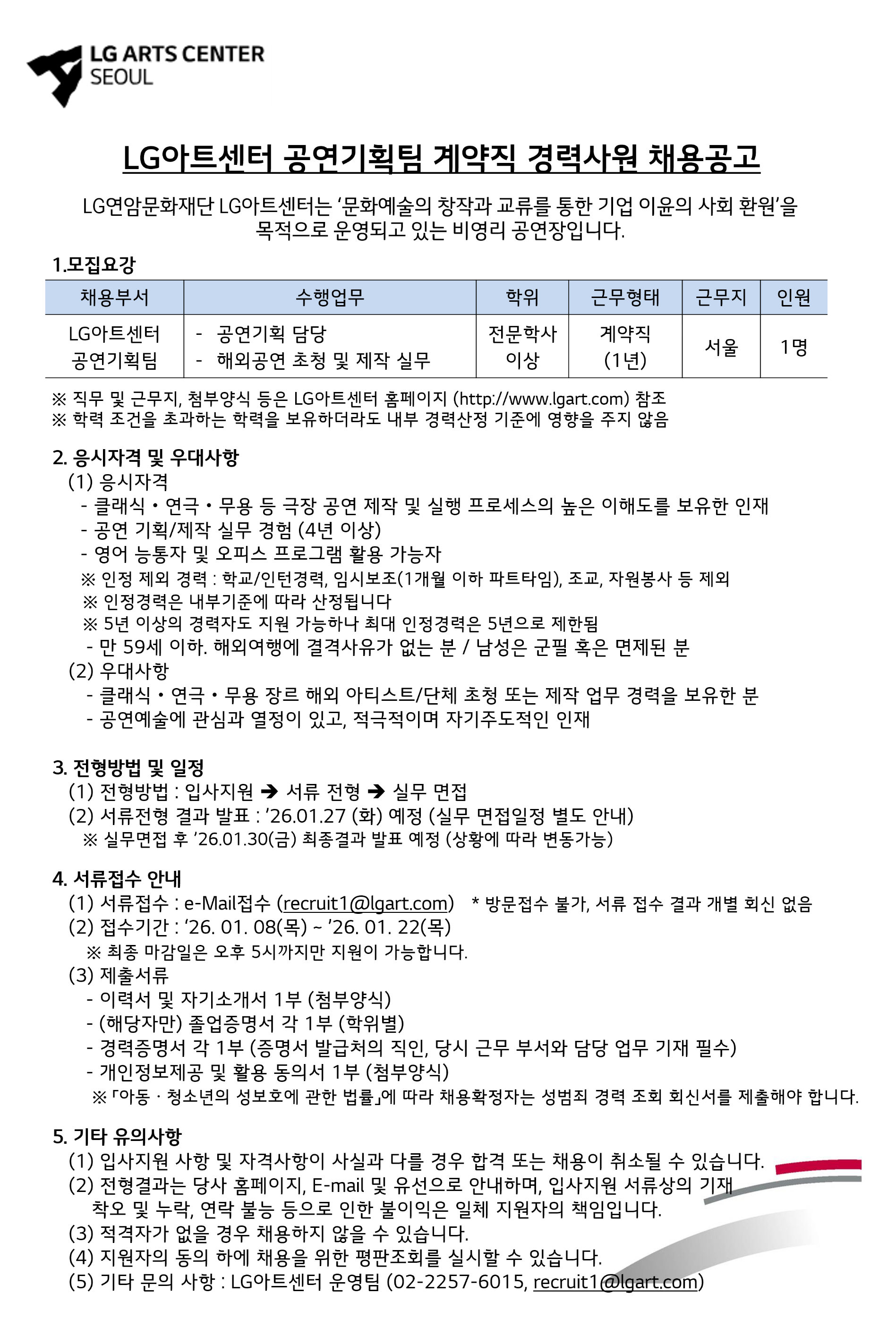 [아트모아] LG아트센터 공연기획팀(기획제작) 계약직 경력사원 채용