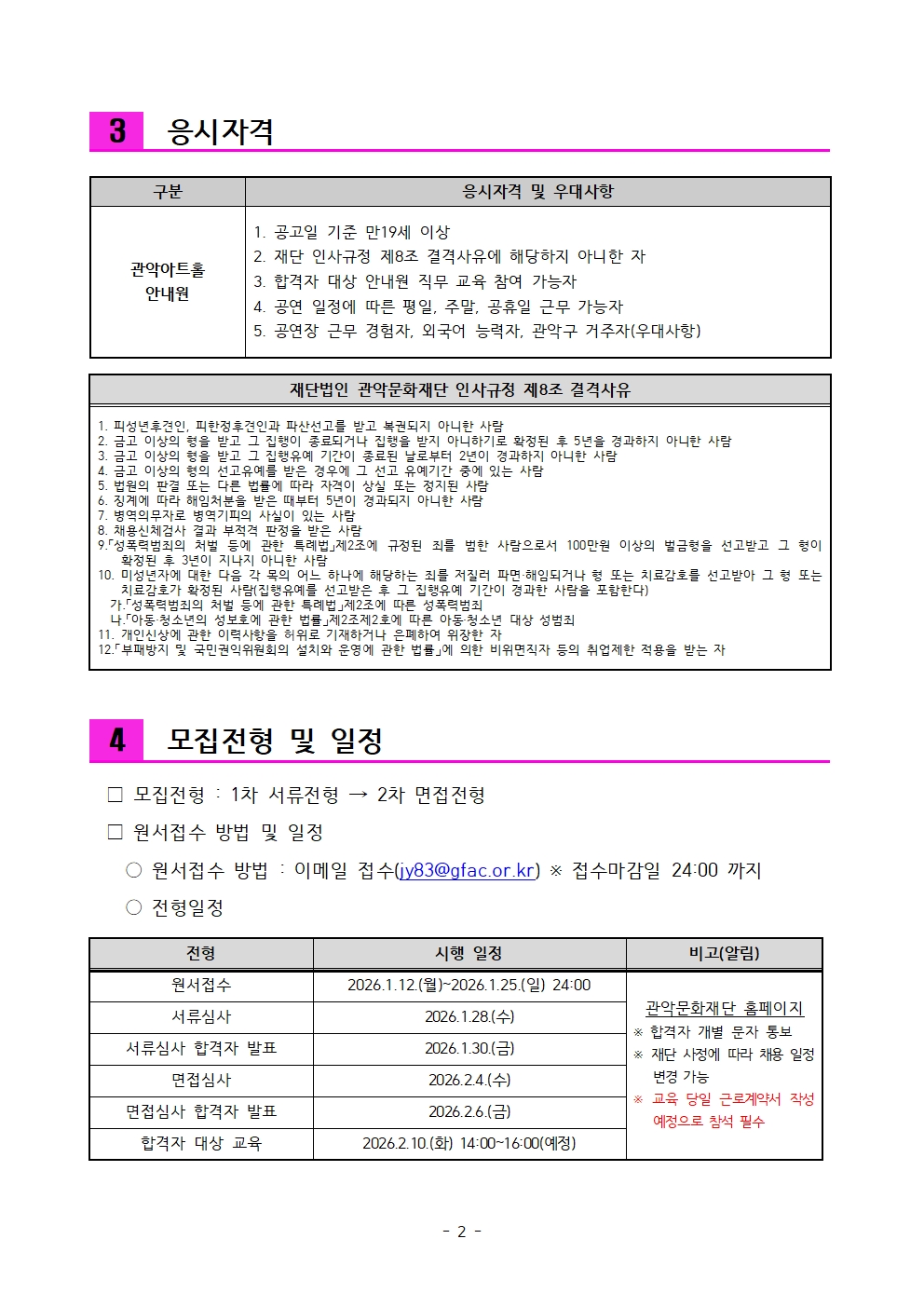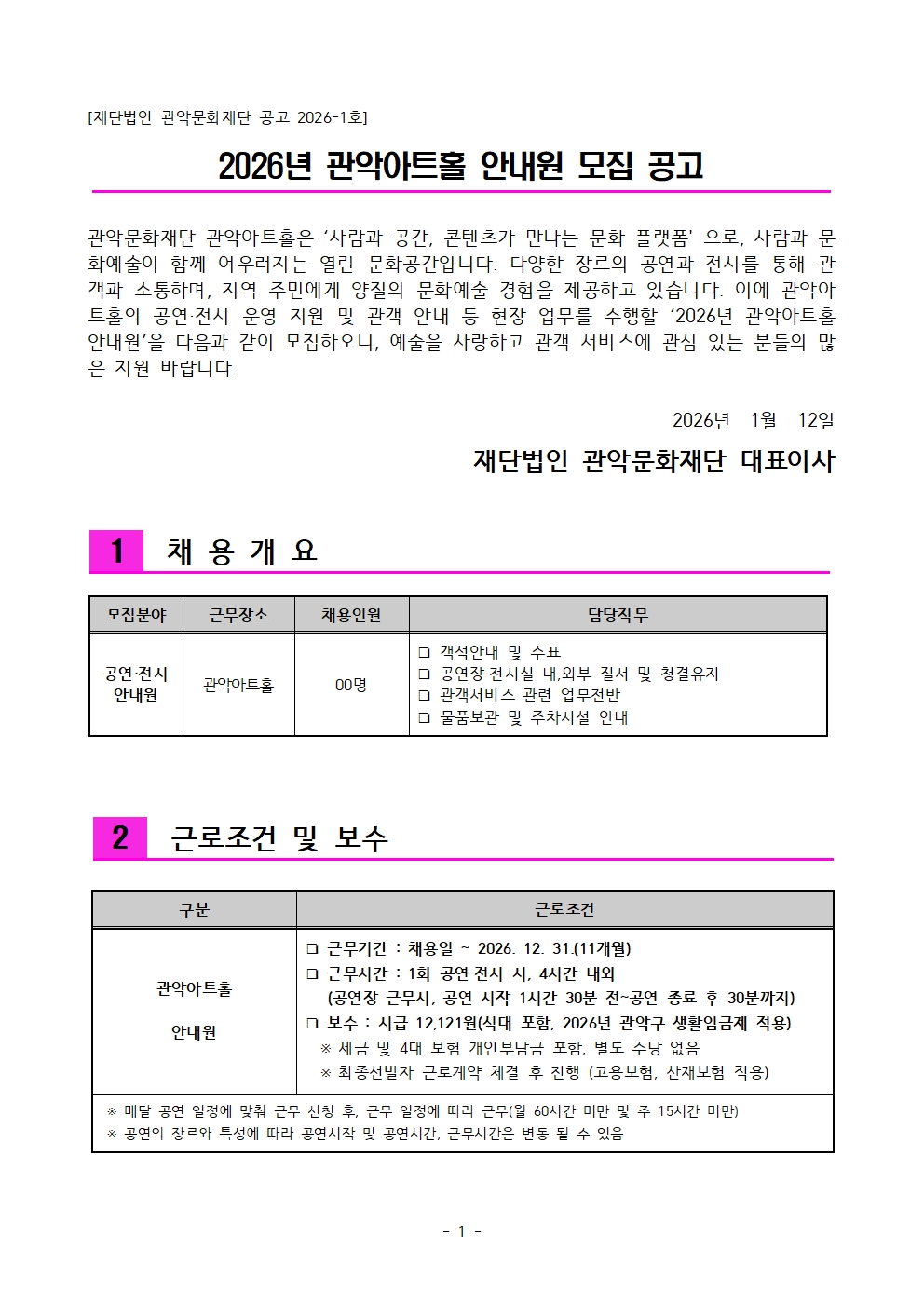 [관악문화재단] 2026년 관악아트홀 안내원 모집 공고 (~1/25 접수마감)