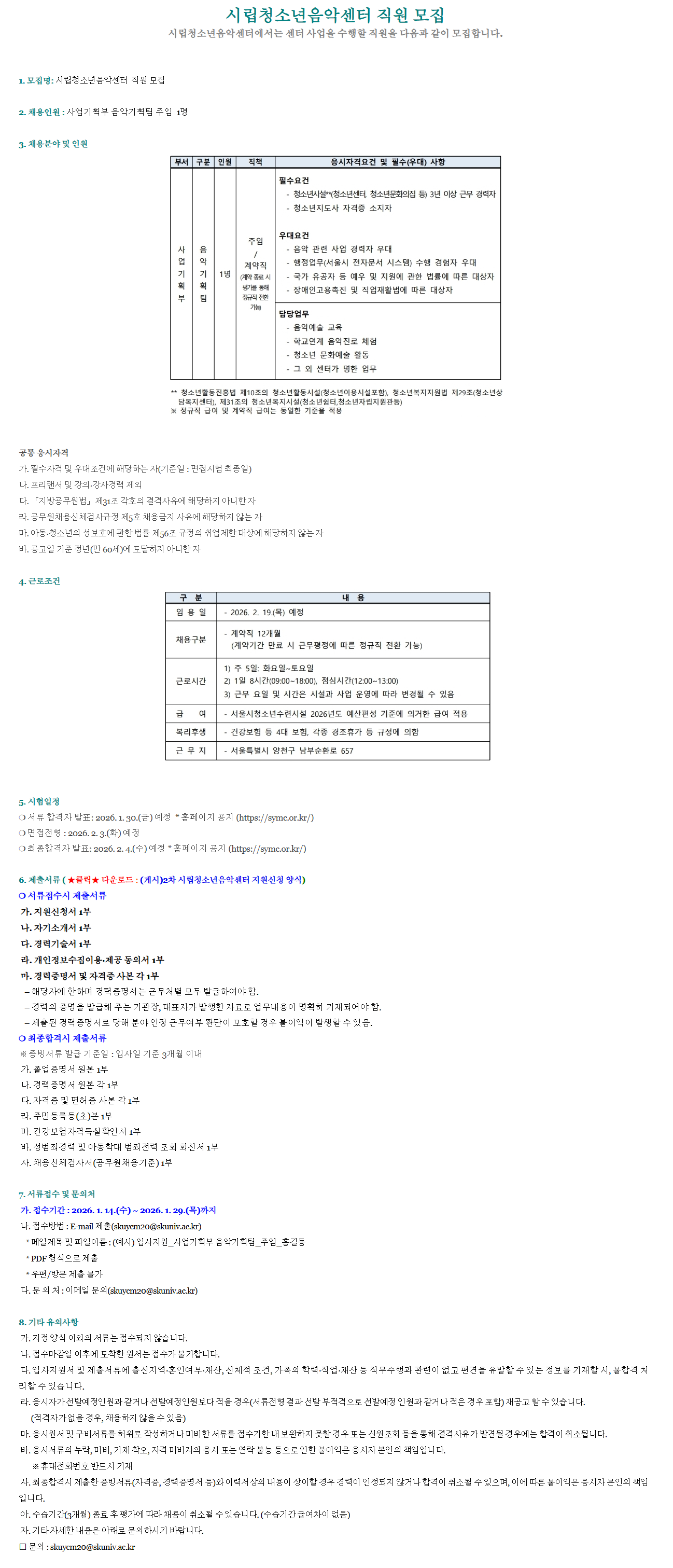 [시립양천청소년음악창작센터] 시립청소년음악센터 사업기획부 음악기획팀 주임 채용