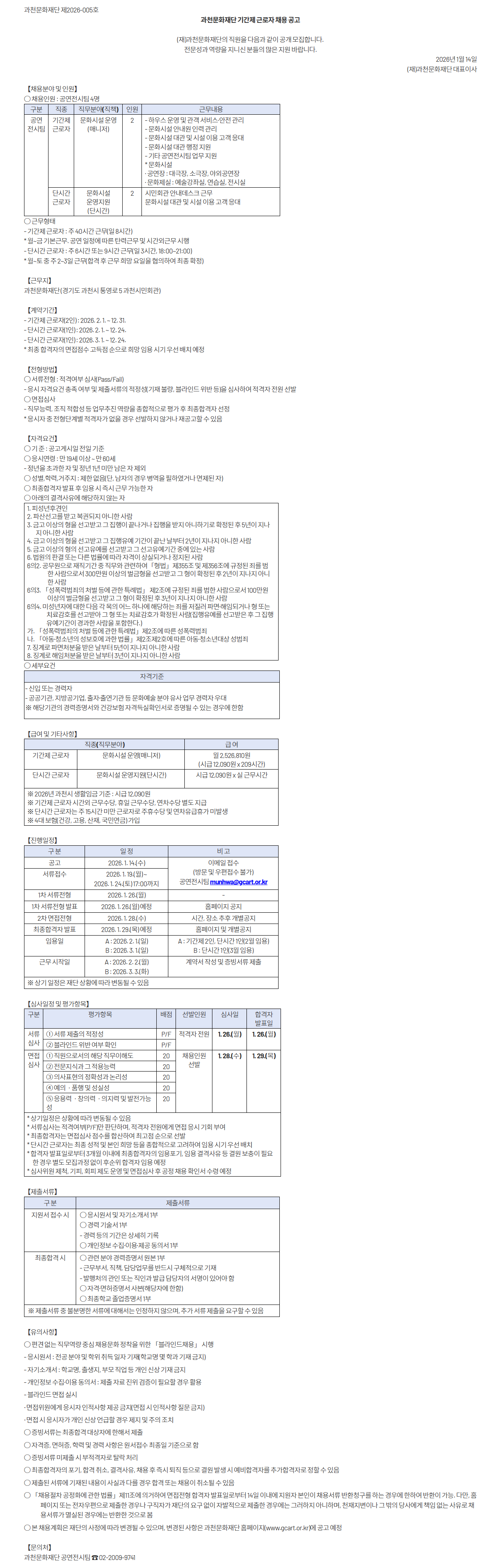 [재단법인 과천문화재단] 2026년 과천문화재단 기간제·단시간 근로자 채용 공고(문화시설 운영)