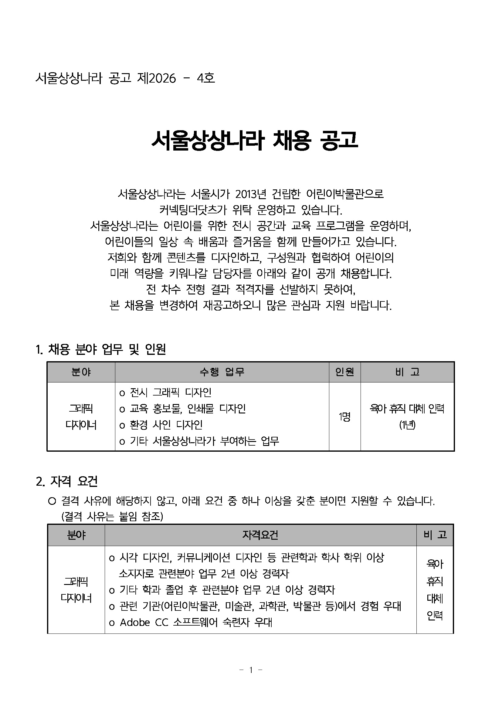 [서울상상나라] 서울상상나라 채용 공고(재공고_육아휴직대체, 그래픽 디자이너)