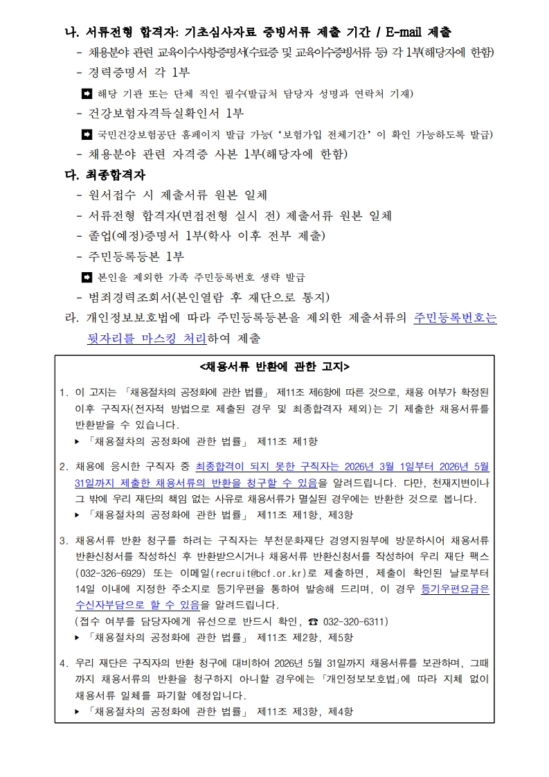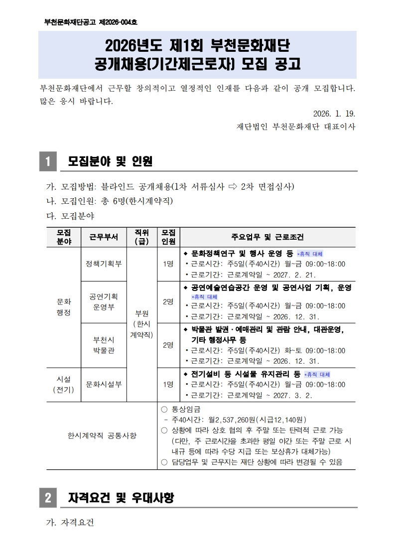 [부천문화재단] [공고 제2026-004호] 2026년 제1회 부천문화재단 공개채용(기간제근로자) 모집 공고